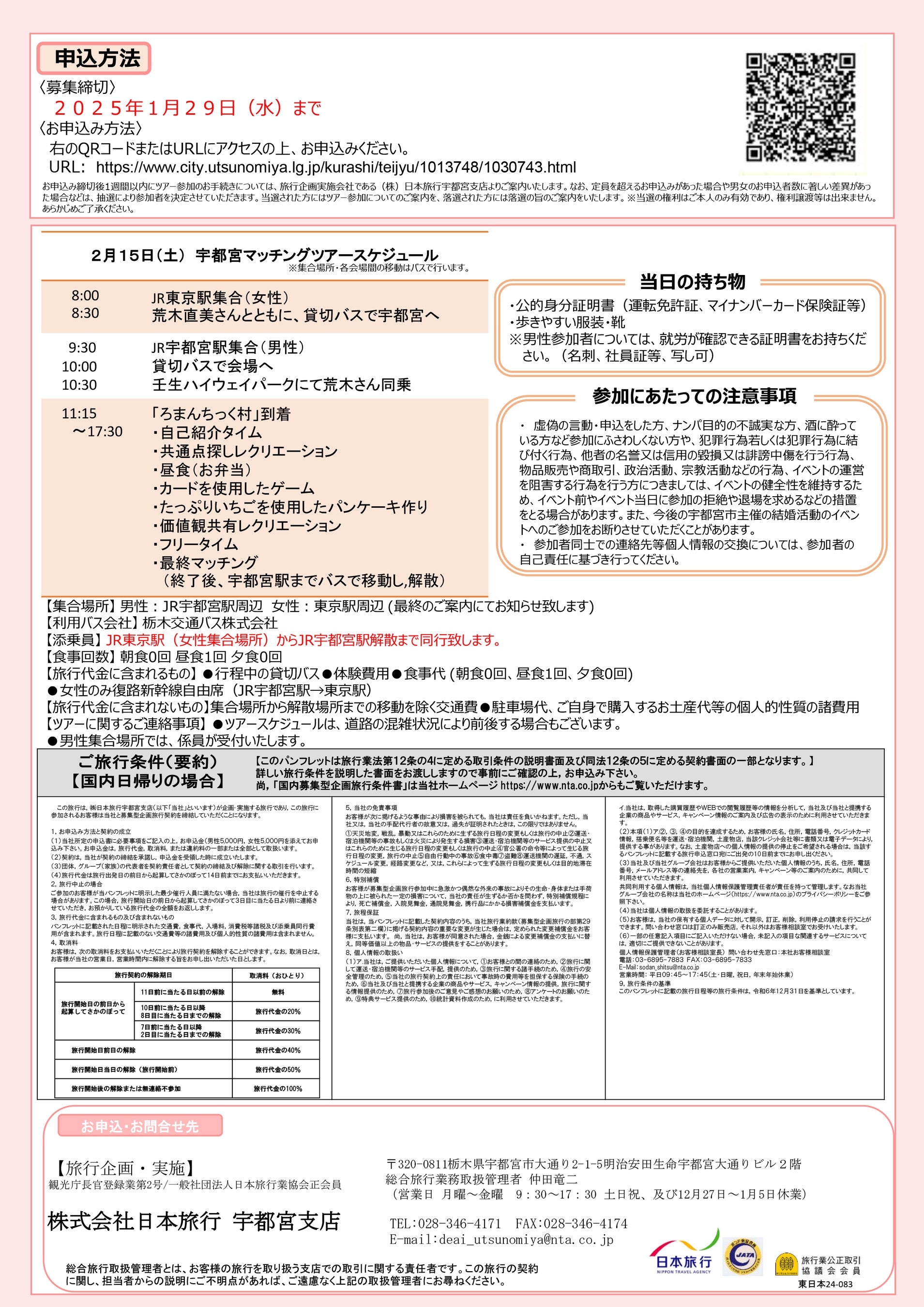 ・ 「道の駅うつのみや ろまんちっく村」を会場とし,「共同作業・共通体験」や,「価値観を共有するレクリエーション」を通じて,より結婚をイメージできるイベントとなっています。(貸し切りバスにより移動)
