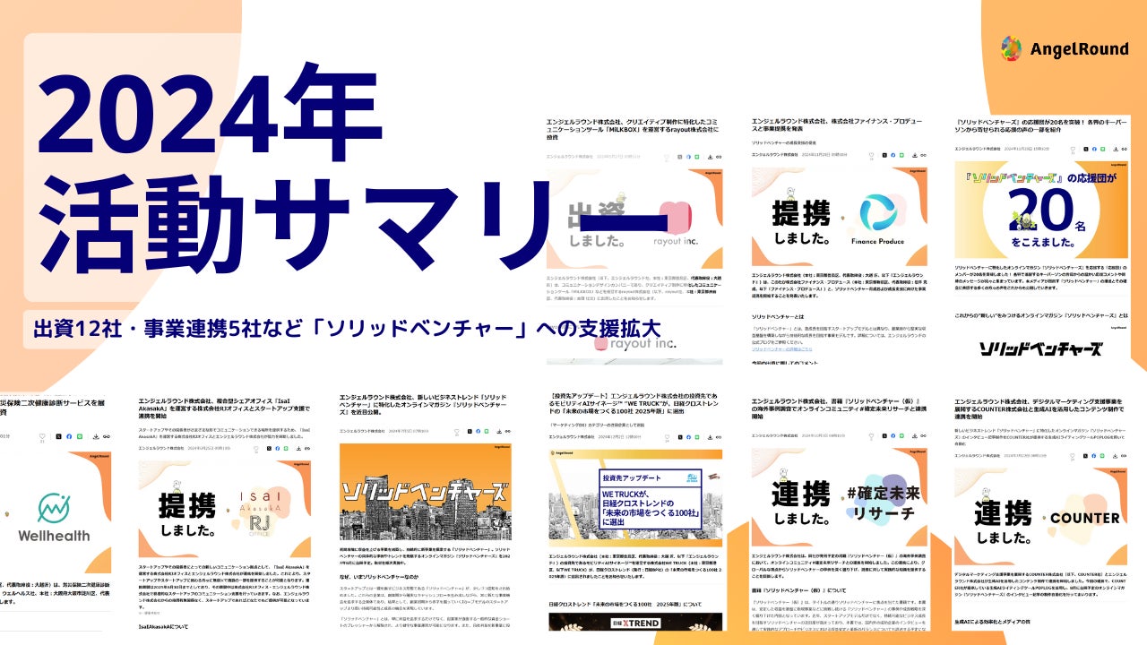 エンジェルラウンド株式会社(本社:東京都豊島区、代表取締役:大越 匠、以下「当社」)は、2024年12月27日、当社が本年配信・実施してきたプレスリリースや各種取組のサマリーを発表いたします。当社は「アーリー投資 × 最小限のファンドサイズ」というファンドコンセプトのもと、IPOだけでなくスモールEXITの可能性にフォーカスした投資活動や、新しい企業体であるソリッドベンチャーにフォーカスする施策を積極的に展開してまいりました。2024年はソリッドベンチャーへの出資12社(詳細は後日リリース予定)を含む多数の成果を達成し、さらなるソリッドベンチャーへの投資拡大を見込んでおります。