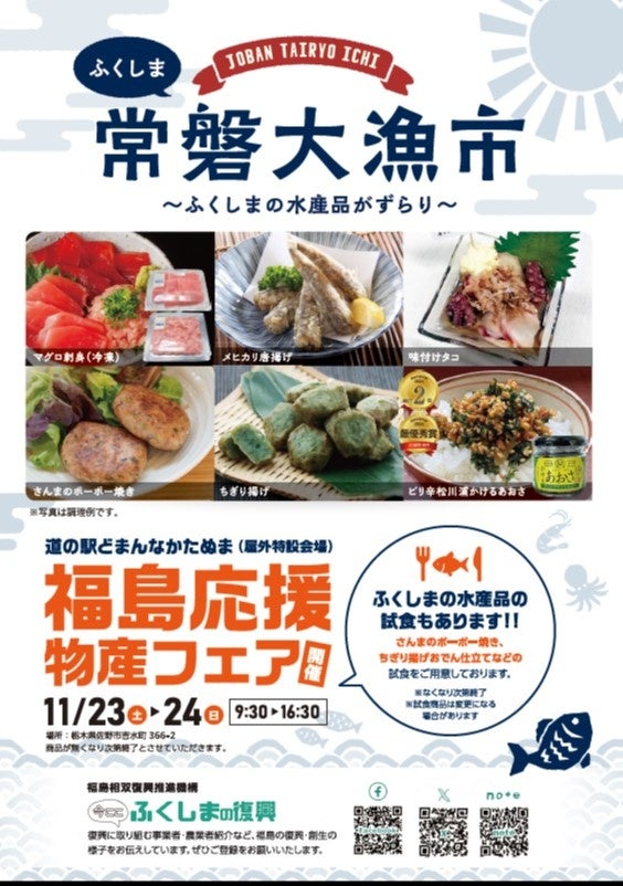 栃木県佐野市の道の駅「どまんなかたぬま」にて、福島県の水産加工品の販売会「ふくしま常磐大漁市」を開催します。道の駅「どまんなかたぬま」を訪れる多くの方に「安心・安全・美味しい」福島県産常磐ものの良さをPRするとともに、福島の水産業の発展に寄与するために企画したイベントです。
