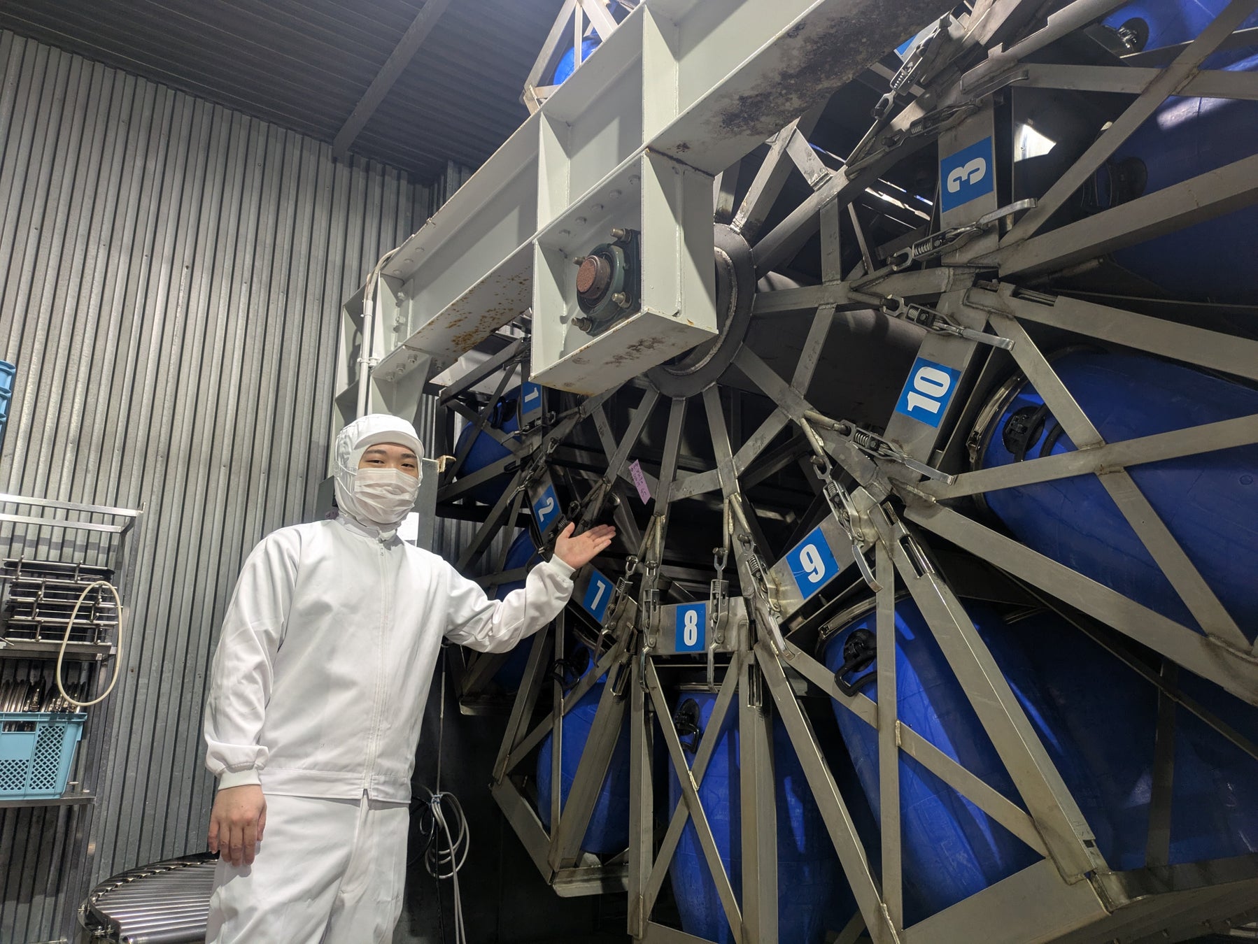 一方、広洋水産では、大きな「メリーゴーランドのような」装置が回転しながら、卵一粒一粒にまんべんなく味を染み込ませていきます。「工場見学でこの機械をみると皆さん、驚きます」と語るのは、広洋水産入社5年目の横川さん。