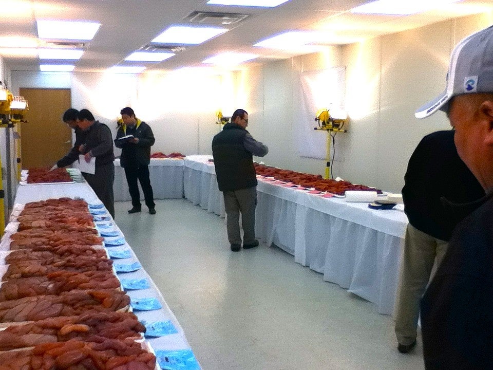 3月と4月のシアトル、2月〜5月の釜山での入札に参加し、1年分の契約を結びます。広洋水産は特に「船上凍結された卵」にこだわりがあり、「漁獲してすぐ、船の中で内臓を取り出し凍結するから色味が違う」とのこと。