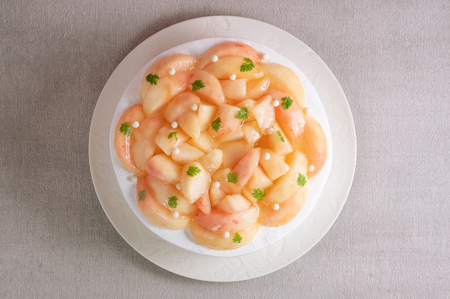 果汁が滴るほどジューシーでとろけるような柔らかい食感の果肉、口いっぱいに広がる上品な甘さと香りが特徴の「桃のショートケーキ」。