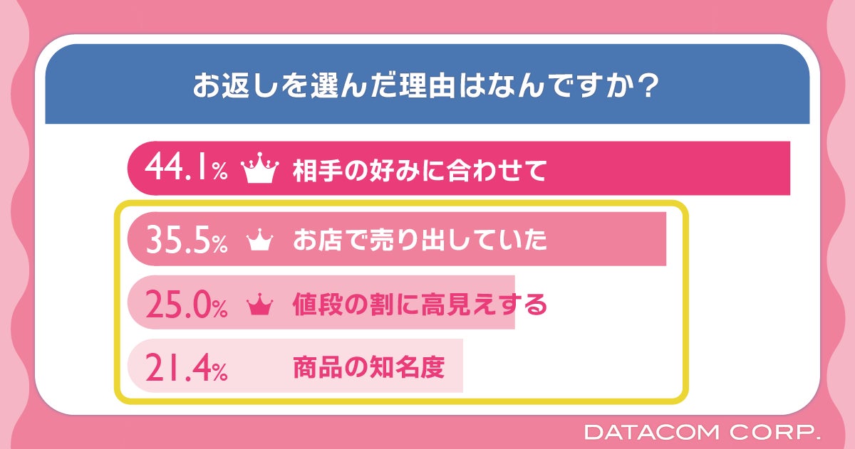 お返しを選んだ理由を聞いたところ、「相手の好みに合わせて」と回答した人が44.1%と最多になりました。一方で、相手の好みをおろそかにして、外的要因やコストパフォーマンスによる選択を行う人も多数。「お店で売り出していた」が35.5%、「値段の割に高見えする」が25.0%という結果になりました。お店の売り出し方や商品の見せ方などに影響を受ける男性が多いことから、売場づくりへの注力がホワイトデー商戦の成功には有用と言えそうです。