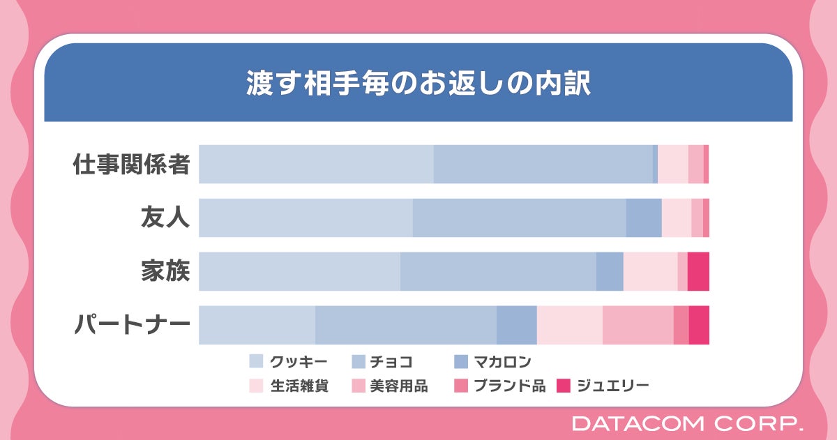 また、渡す相手とお返しの詳細を見てみました。「チョコ」や「クッキー」などは誰にでも渡せる定番品ですが、「生活雑貨」や「美容用品」になると家族やパートナーなどに渡す人の比率が高くなっています。