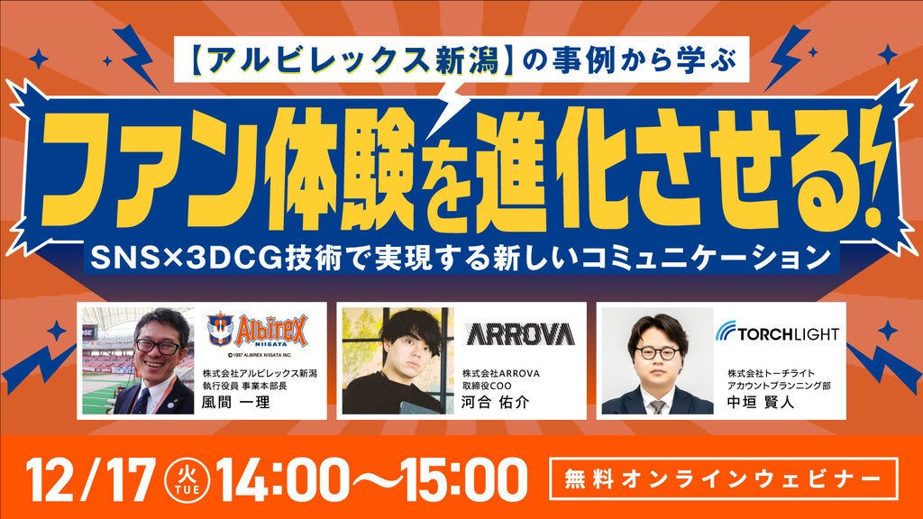 このたび、株式会社ARROVA(本社:東京都渋谷区、代表取締役社長:荒井 浩介、以下 ARROVA)は、株式会社トーチライト(本社:東京都渋谷区、代表取締役社長:熊田 聡、以下「トーチライト」)とJリーグ加盟プロサッカークラブの株式会社アルビレックス新潟(新潟市中央区、代表取締役社長:中野幸夫、以下 アルビレックス新潟)と共催で、「ファン体験を進化させる!SNS×3DCG技術で実現する新しいコミュニケーション」と題した無料オンラインセミナーを2024年12月17日(火)に開催いたします。
