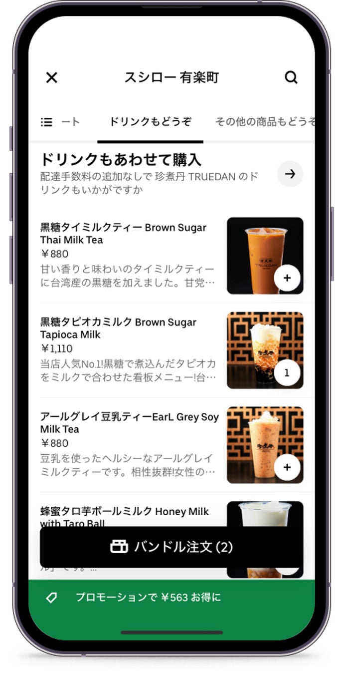 お料理の注文に別店舗のドリンクやデザートを組み合わせたり、ティッシュペーパーや洗剤、ペットフードなどの不足している日用品をまとめて注文するなど、お客さまの好みに合わせてお楽しみいただけます。また、お子さまには別の料理を注文したい時や、家族やパートナーと食べたいものが異なる時など、幅広いシーンでUber Eatsをよりお得に利用できます。