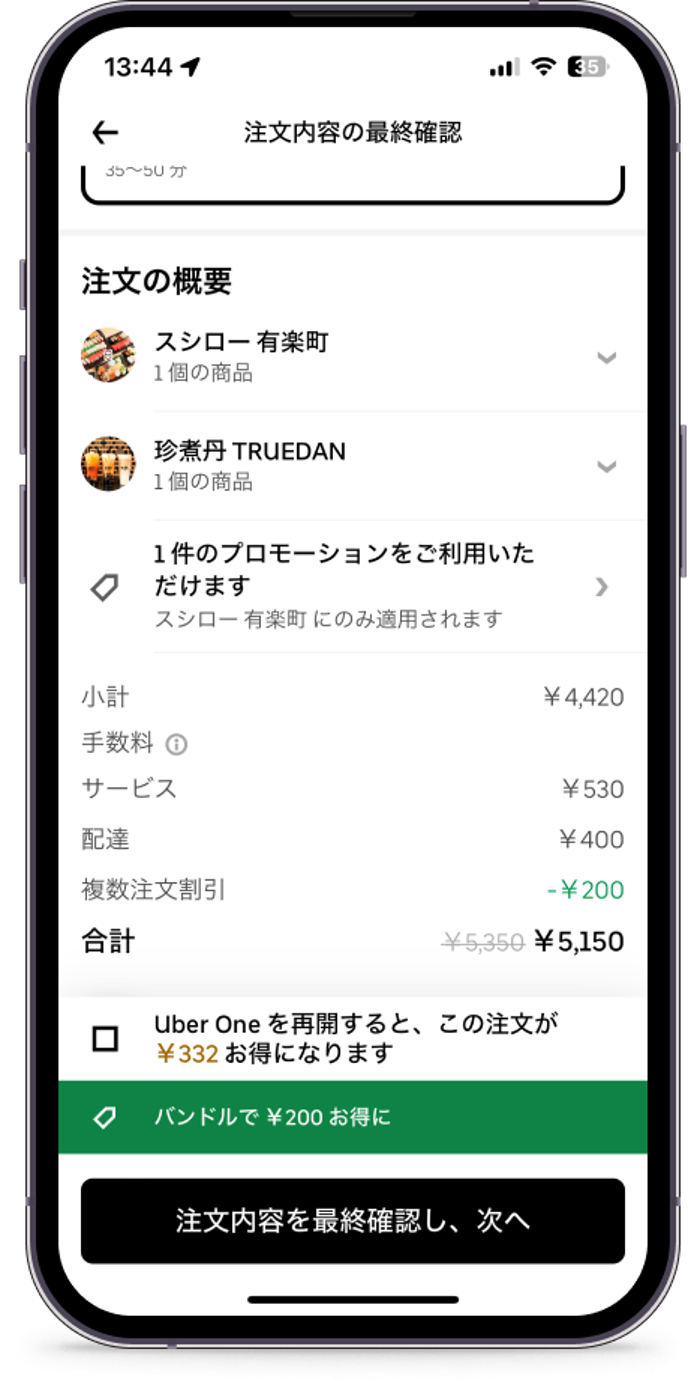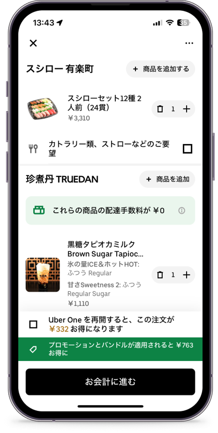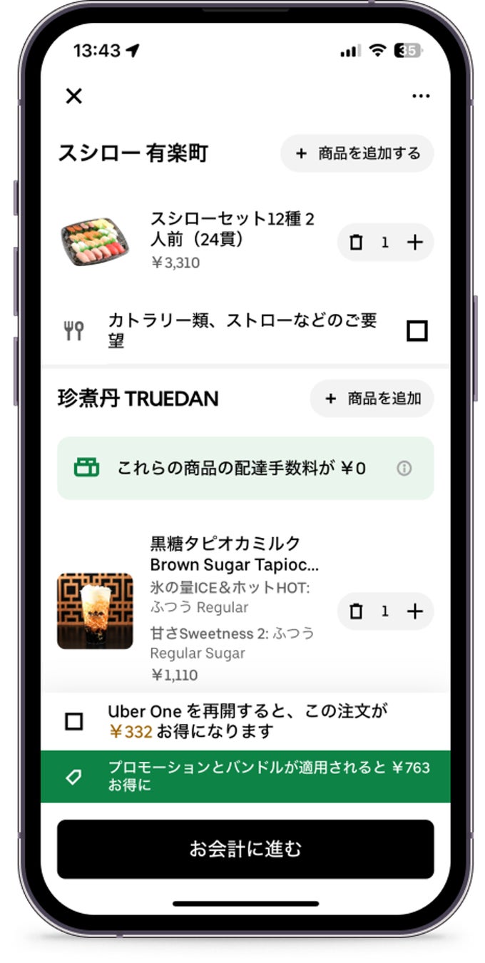 Uber Eatsは、これまでも最初の注文から10分以内であれば、限られた対象店舗において、組み合わせ注文が可能となる機能を提供しており、多くのお客さまからご好評いただいていました。今回の機能導入により、これまで以上に幅広いUber Eats加盟店の商品を、決済完了前の時点で自由に組み合わせ、1回分の配達手数料でまとめてお買い求めいただけます。
