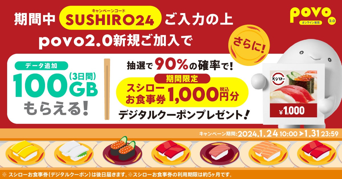 また、1月31日までのpovo2.0新規加入で、100GB(3日間)を必ずもらえるほか、抽選で90%の確率(注1)で「スシローお食事券」1,000円分があたるキャンペーンを開催します。