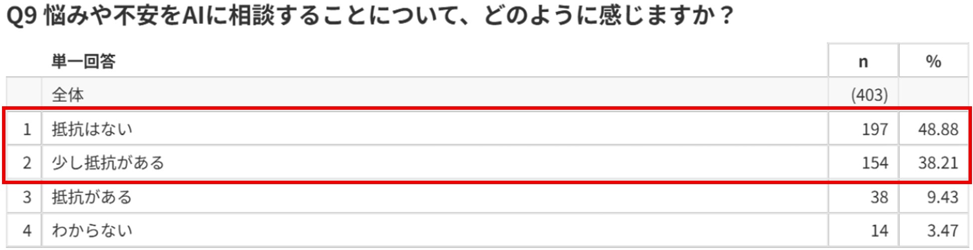 AIへの相談に対して「抵抗はない」「少し抵抗がある」と回答した人は約9割にのぼり、完全な拒否感を持つ人は少数にとどまりました。