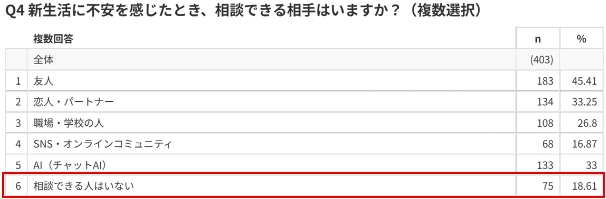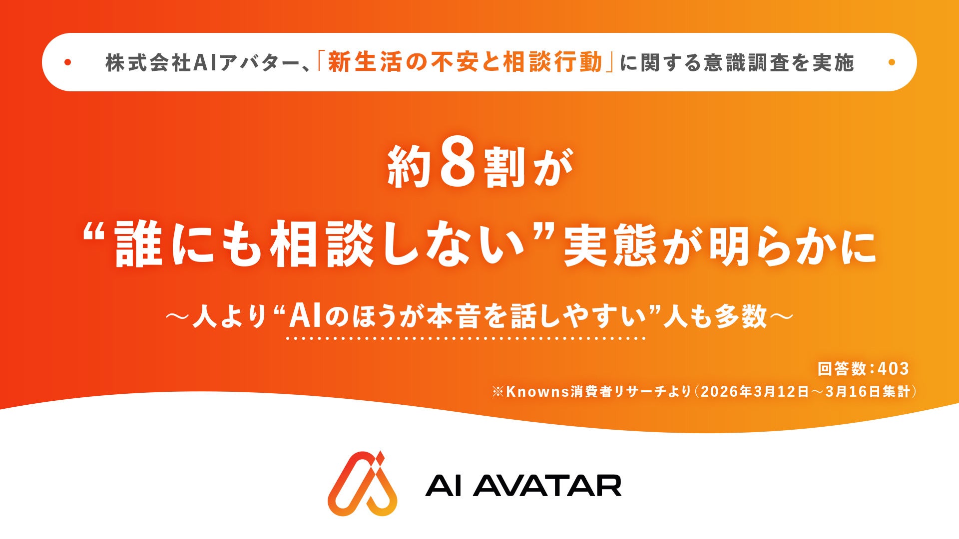 努力するあなたの“絶対的な応援団”を掲げる株式会社AIアバター(本社:東京都千代田区、代表取締役:加藤一郎、以下「当社」)は、全国の10代~50代男女403名を対象に「新生活の不安と相談行動に関する意識調査」※¹を実施しました。