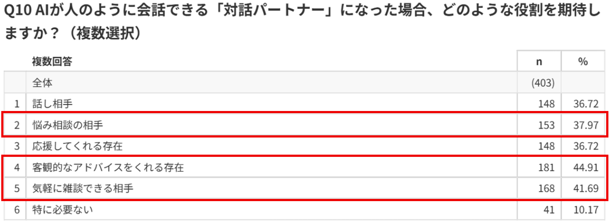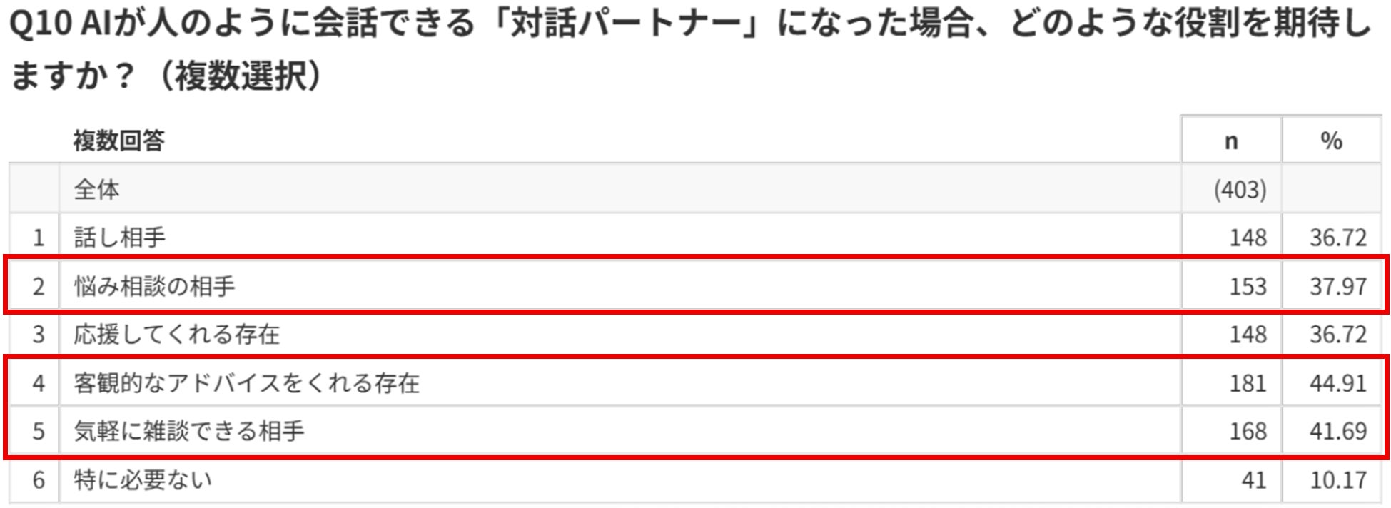AIに期待する役割としては、「客観的なアドバイス」「気軽な雑談」「悩み相談」などが上位となり、実用性と心理的サポートの両方が求められていることが明らかになりました。