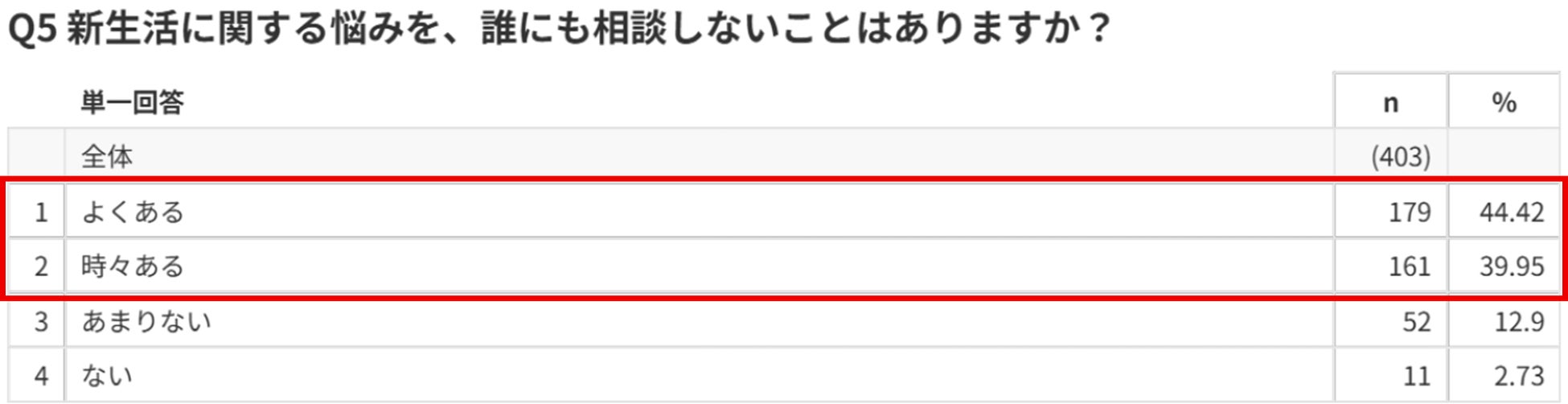 新生活に関する悩みについて、「よくある」「時々ある」を合わせて84.3%が「誰にも相談しないことがある」と回答しました。