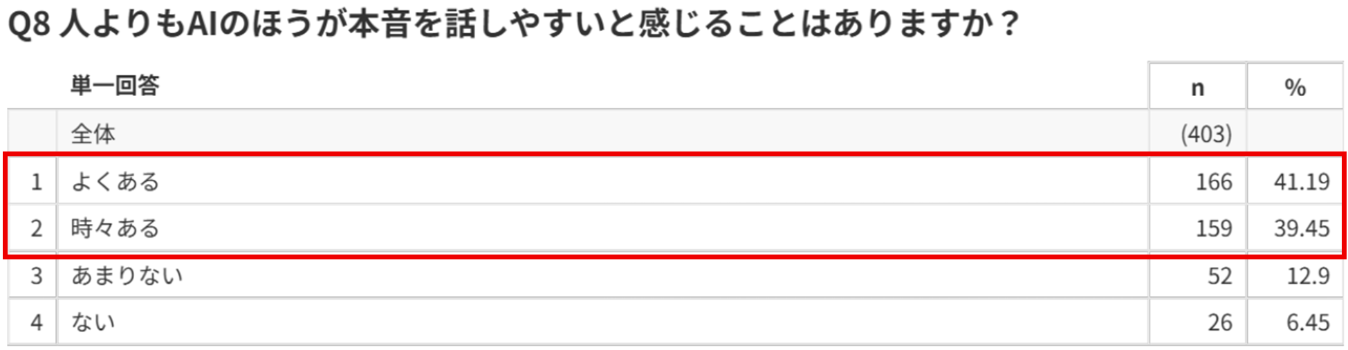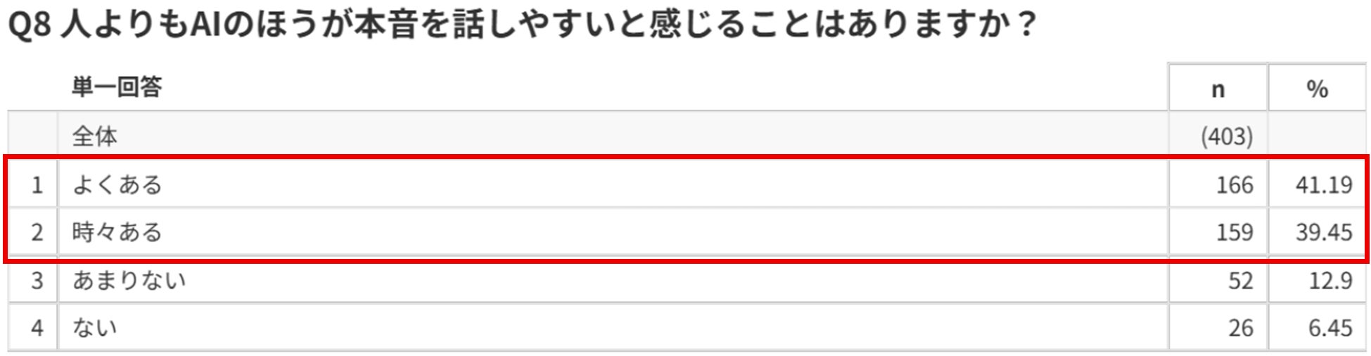 「AIのほうが本音を話しやすい」と感じた経験がある人は約8割に達し、AIは心理的ハードルの低い相談相手として機能していることが示されました。
