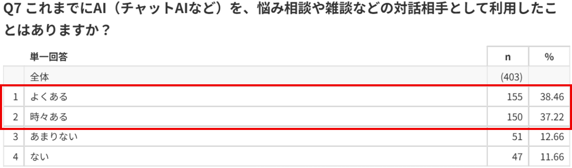 AIを悩み相談や雑談の相手として利用した経験は約7割にのぼり、日常的な対話相手としての活用が広がっていることがうかがえます。