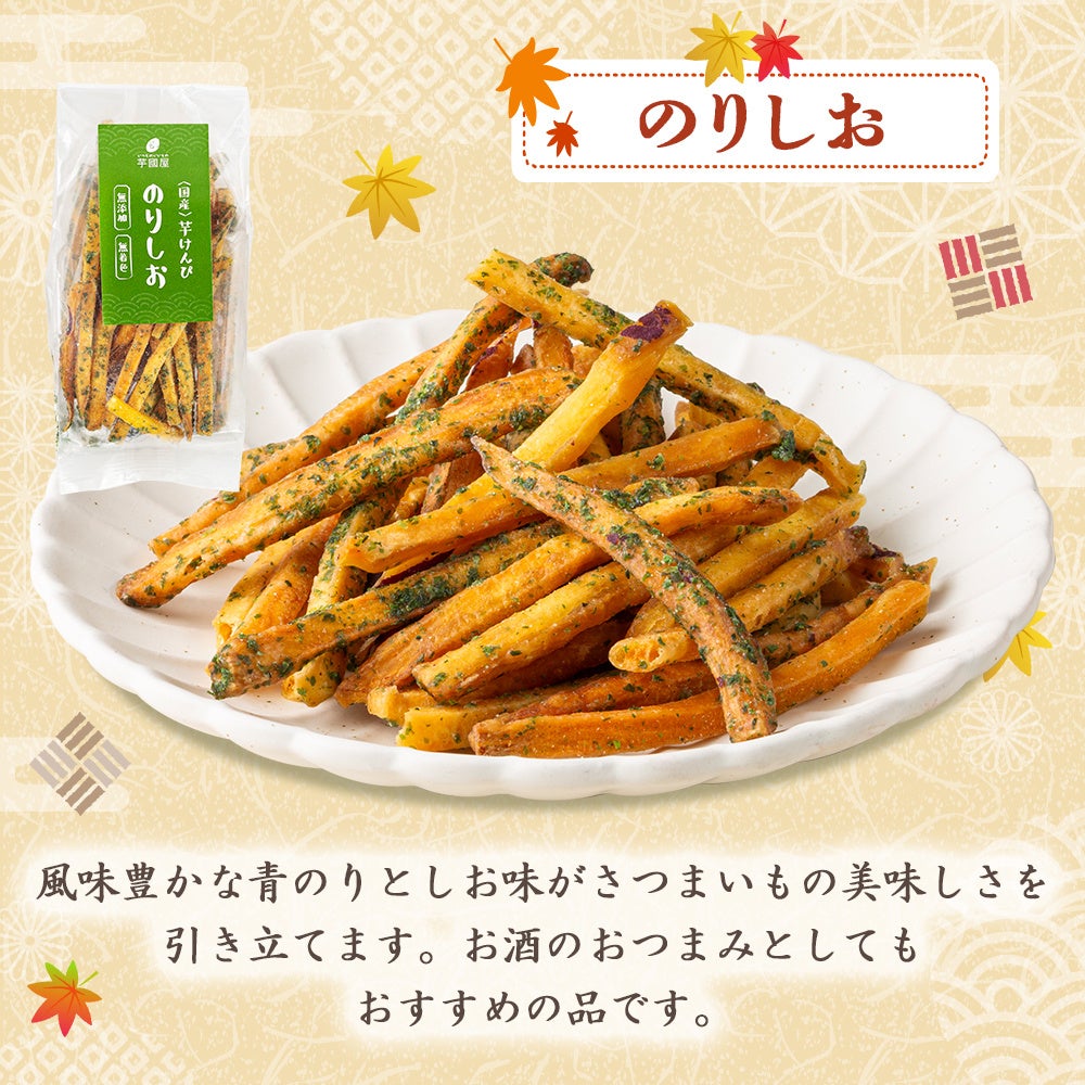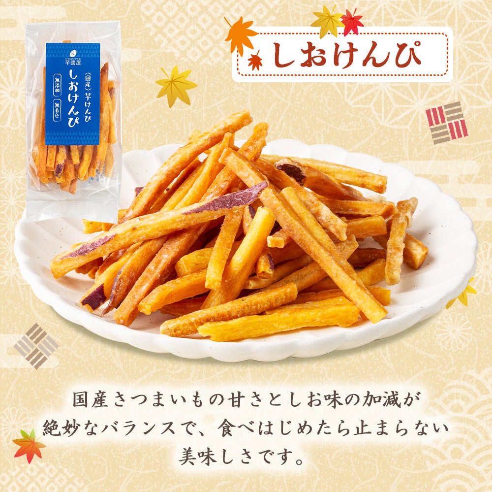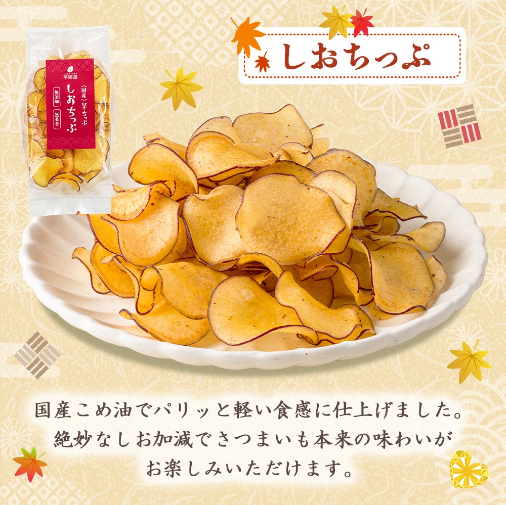 「敬老の日ギフトBOX」は単品では販売していない芋けんぴの、のりしお味、塩味、芋チップが入っております。国産のさつまいもを国産こめ油で揚げているので、健康的でカリッとした食感。おやつだけではなくお酒のおつまみにもオススメです。