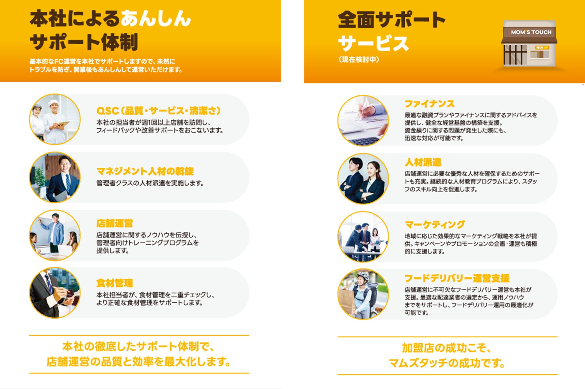 マムズタッチでは、フランチャイズ加盟を検討する創業希望者に向けて、立地や規模、事業計画に応じたオーダーメイド型の支援体制を整えています。加盟奨励金の提供やロイヤルティ制度の柔軟な設計、マーケティング・PR面でのサポートなど、さまざまな支援を通じてスムーズな出店を後押しします。