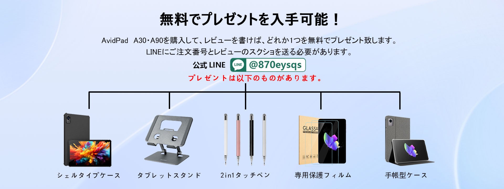 無料でプレゼントを入手可能! AvidPad A30・A90を購入して、レビューを書けば、どれか1つを無料でプレゼント致します。