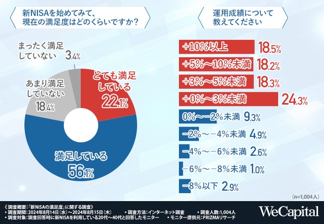 『ヤマワケ』(https://yamawake.jp/)の運営会社であるWeCapital株式会社(本社所在地:東京都港区、代表取締役:松田 悠介/橋口 遼)は、新NISAを利用している20代〜40代1,004人を対象に、「新NISAの満足度」に関する調査を実施しました。