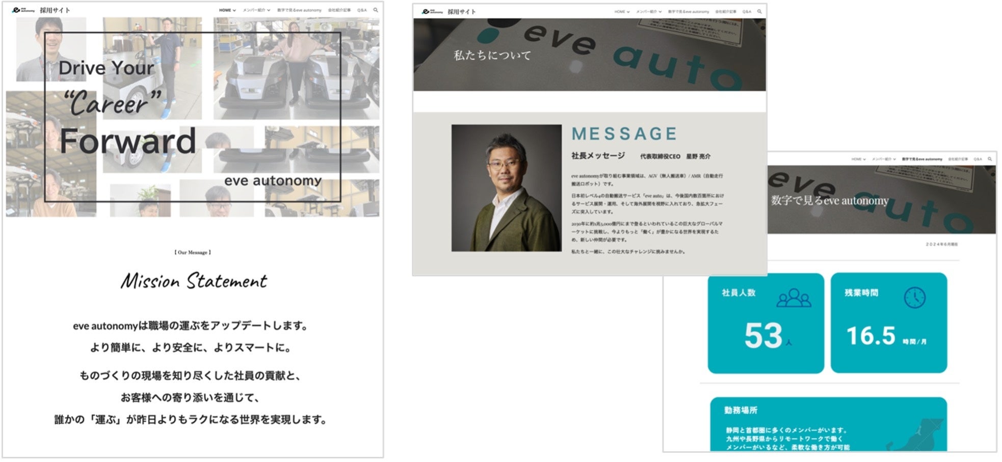 成長を続けるeve autoサービスを支える優秀な人材を募集するため、eve autonomyは新たに採用サイトを立ち上げました。新しい採用サイトでは、会社のビジョンやミッション、現在の募集職種、福利厚生などが詳細に紹介されています。また、社員インタビューや職場の雰囲気を伝えるコンテンツも豊富に掲載されており、求職者にとって現場の状況が伝わる、非常に有益な情報が満載です。