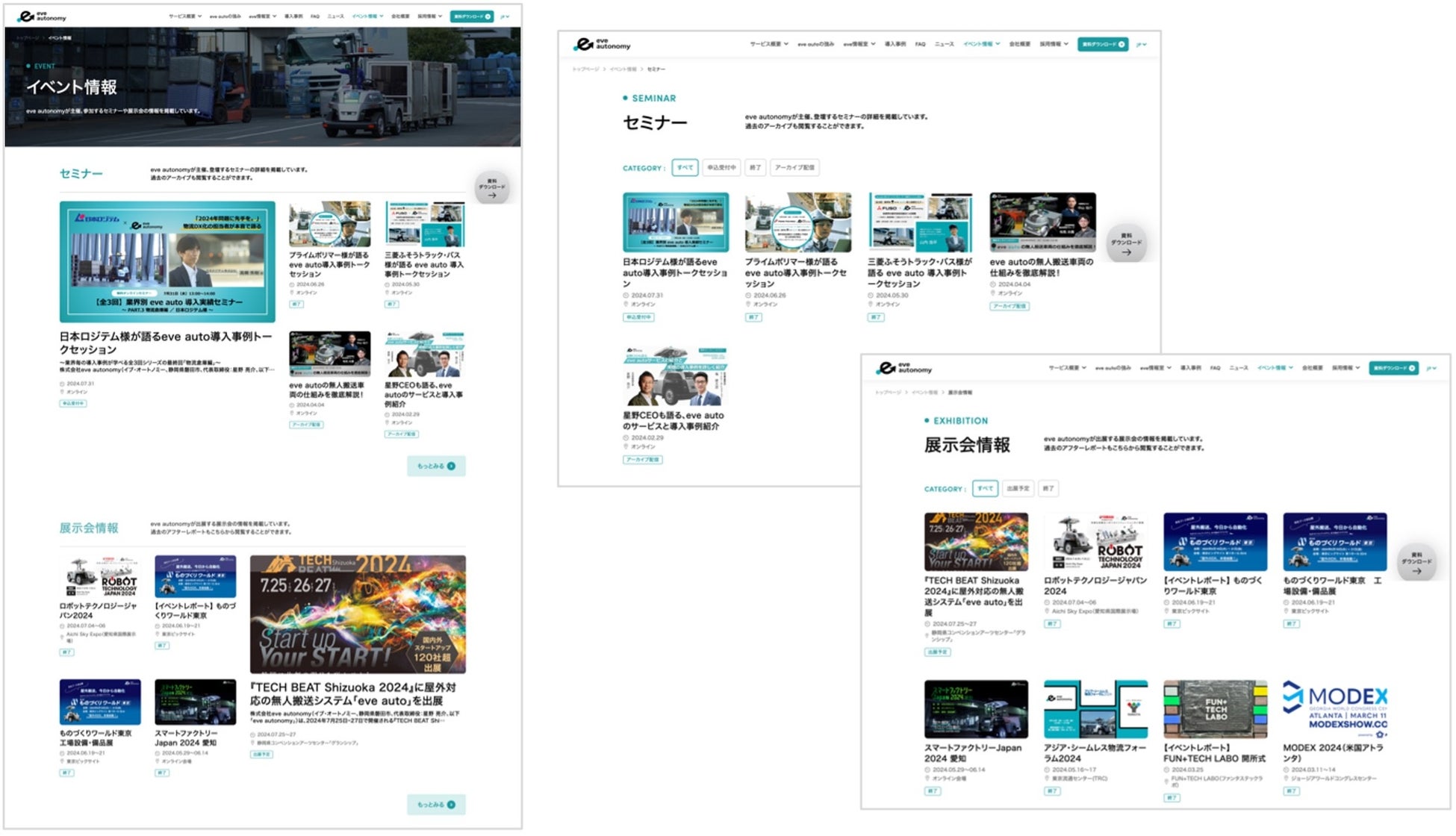 eve autonomyは、最新のイベント情報を一元管理し、多くの方々に情報が探しやすい形でご提供するために、公式サイト内に新たにイベント情報プラットフォームを立ち上げました。このプラットフォームでは、今後開催される展示会、セミナー、ワークショップなどの詳細情報はもちろん、過去の出展情報やレポート、オンラインセミナーのアーカイブ動画などがご覧いただけます。詳細ページにはイベントのスケジュール、登録方法、会場案内などが主に掲載されており、ユーザーの皆様が簡単に参加申し込みや情報収集ができるよう設計されています。
