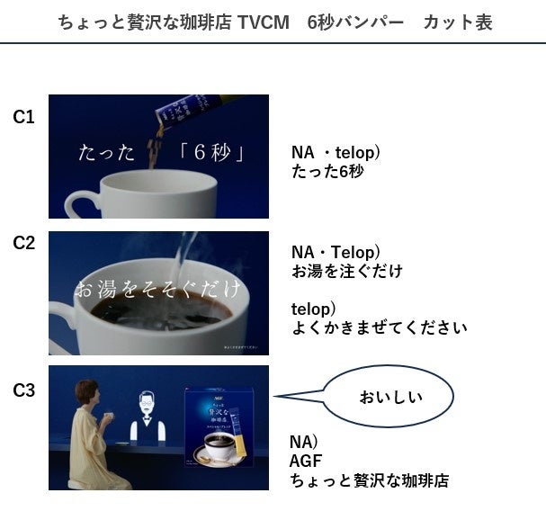 また、オンライン限定で、同ブランドのスティックブラック(個包装タイプのインスタントコーヒーまたはインスタントコーヒー調製品)を訴求した『たった6秒、贅沢時間』篇も同時に展開します。お湯をそそぐだけで、忙しい中でも簡単に珈琲店体験が愉しめることを表現しています。