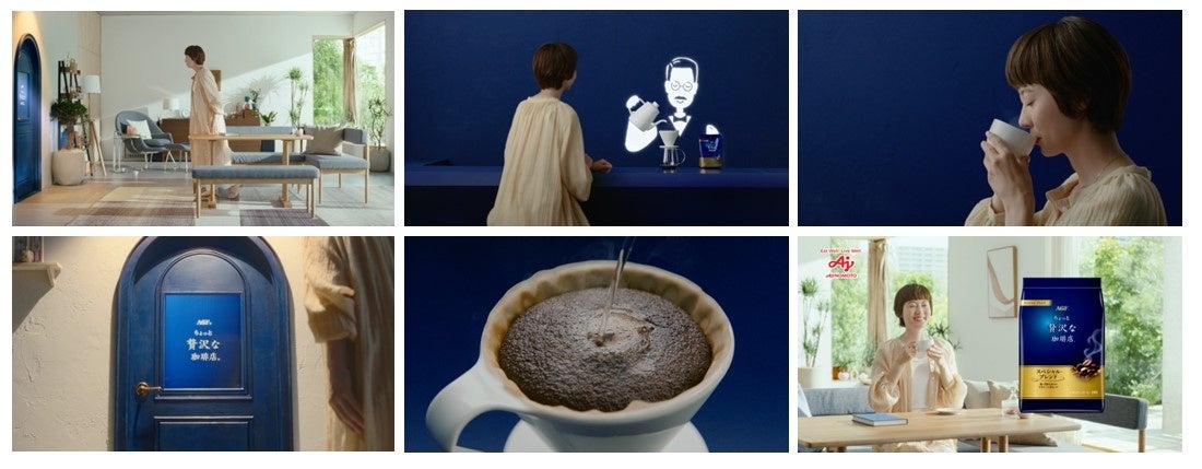 主人公がふとコーヒーが飲みたくなると、部屋の中に青い珈琲店のドアが現れます。そのドアからはコーヒーのいい香りが漂ってきました。ドアには「ちょっと贅沢な珈琲店®」の文字が。入ってみると、「どうぞ」とやさしい言葉をかけてくれるマスター。丁寧にドリップされるコーヒーの香りに癒されていると現実の世界に戻り、家のリビングで愉しむ、いつものコーヒー時間であることがわかります。