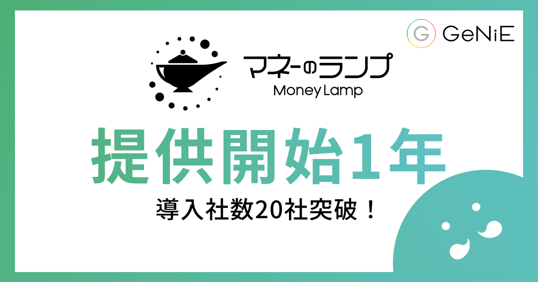 GeNiE株式会社(本社:東京都中央区、代表取締役社長:齊藤雄一郎、以下「GeNiE」)は、2024年10月より組込型金融サービス「マネーのランプ」を提供しています。この度、サービス提供開始から1年で「マネーのランプ」の導入社数が20社を突破したことをお知らせします。