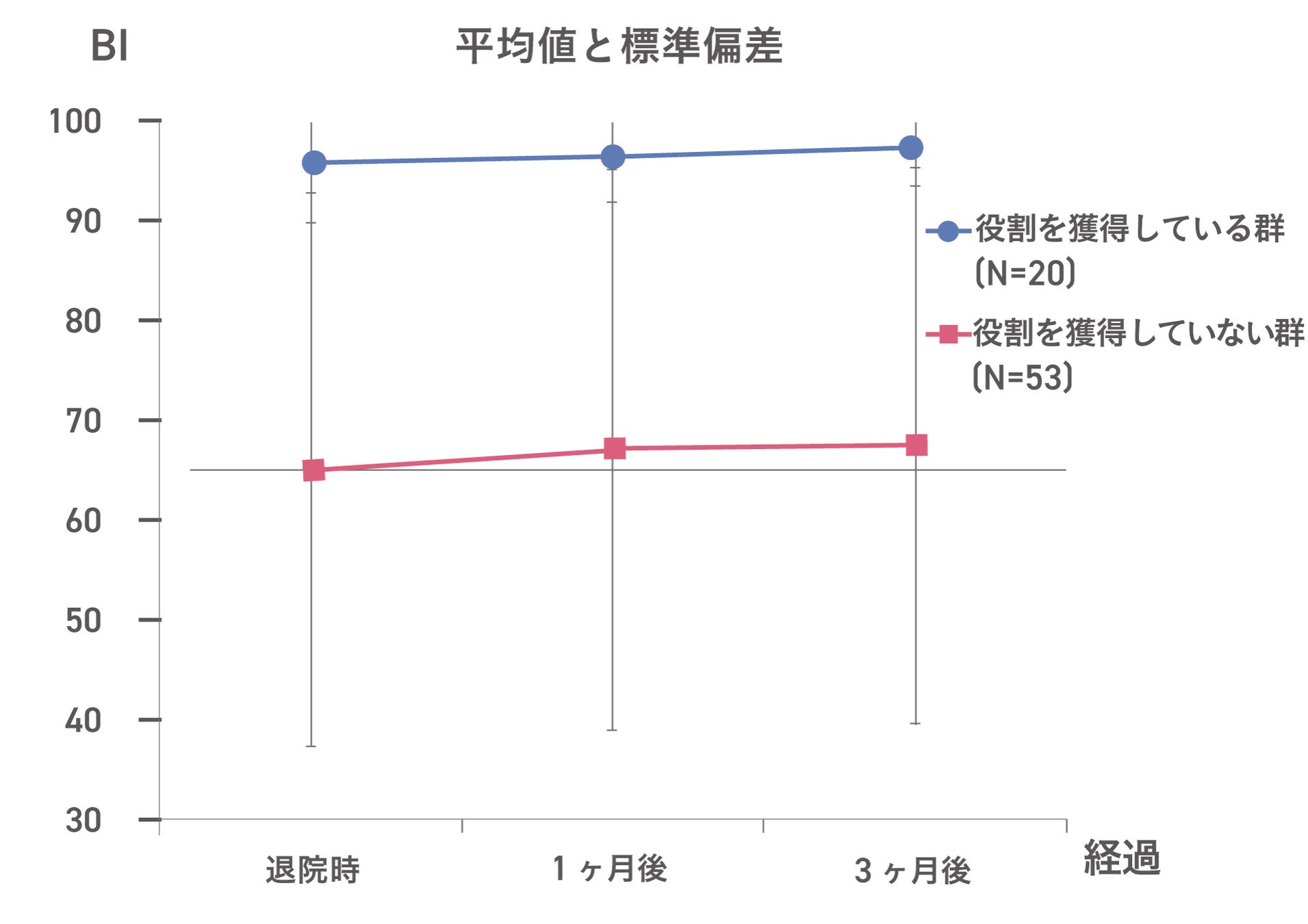 退院時,1ヶ月後,3ヶ月後における2群間の比較では,役割を獲得している群が役割を獲得していない群に比してBIで有意に高い結果となった。