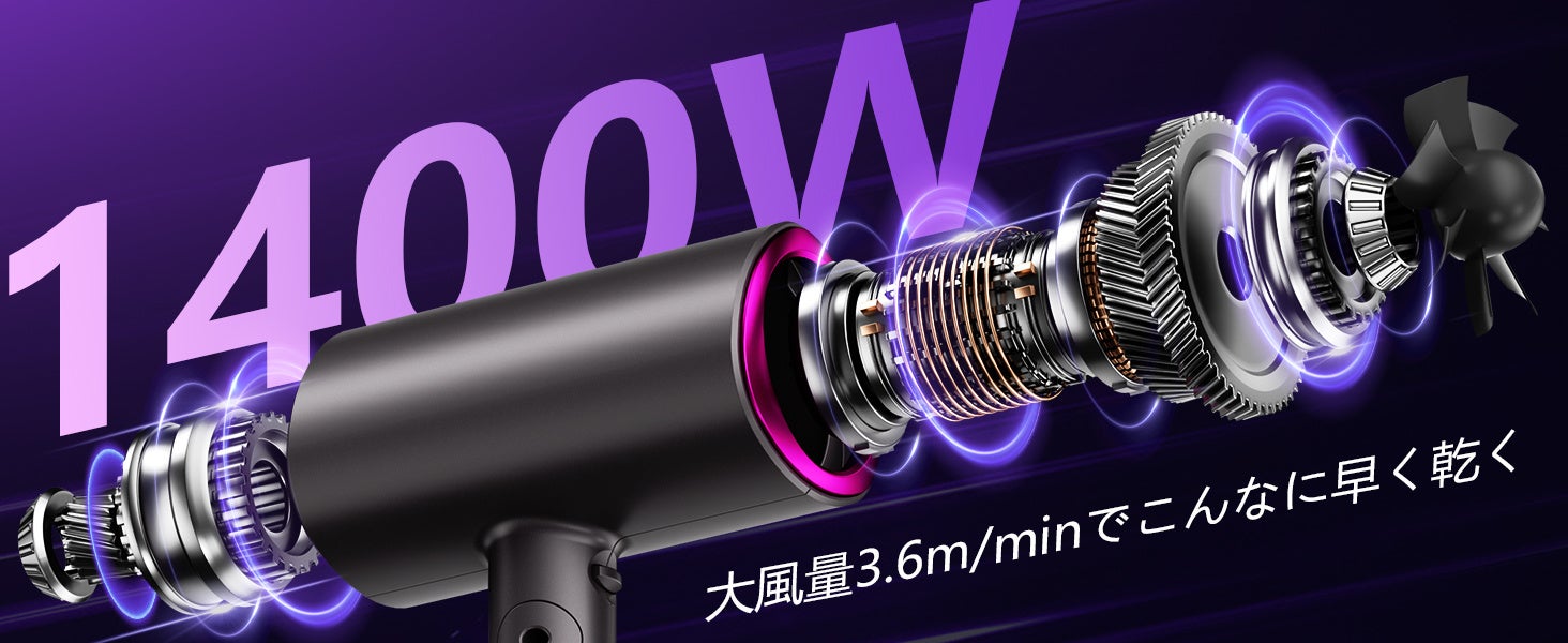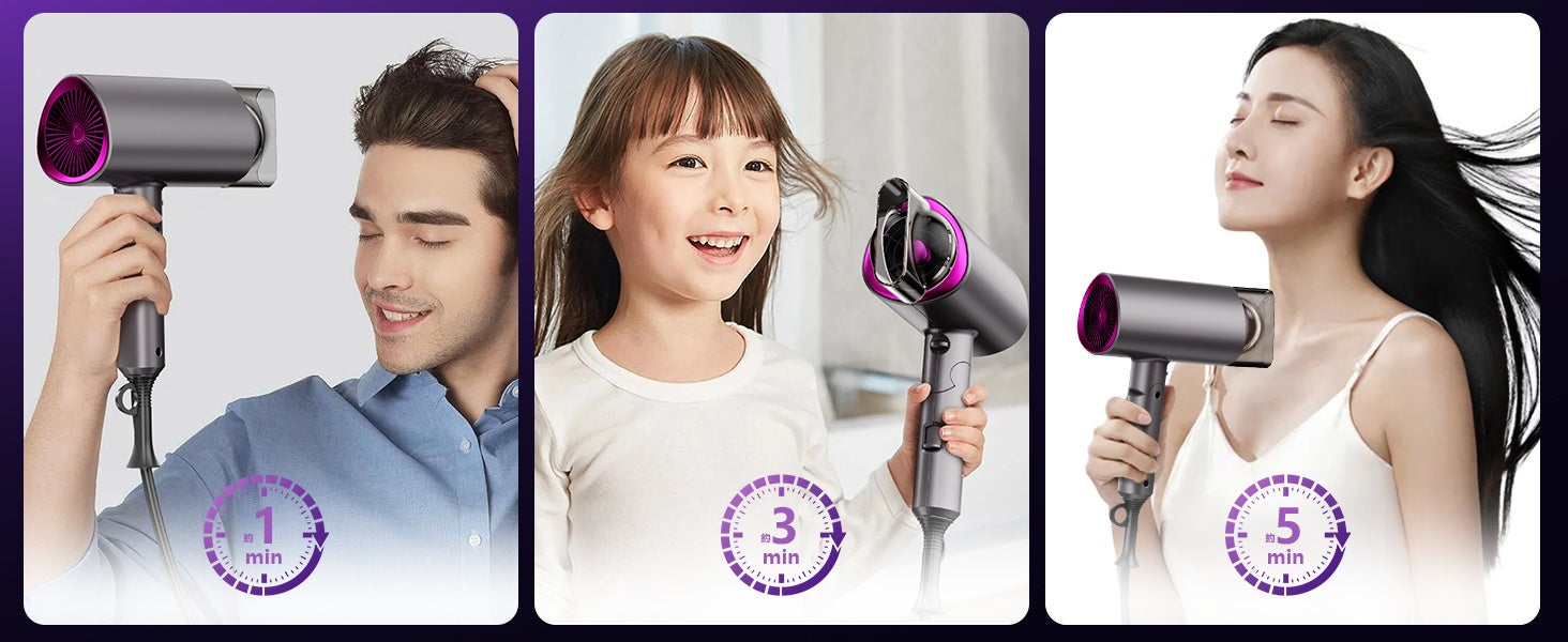 この度、私たちは革新的な第9世代の超高速モーターを搭載した、【60秒速乾・3倍大風量】ドライヤーを発表いたします。従来のドライヤーと比較して、風速3.6m/s、風量は3倍に増加しました。髪がみるみる乾燥し、美しいスタイルに仕上がります。更に、360°回転ノズル付属、平らな空気出口は空気をより集中させ、髪を素早く乾燥させます。朝の時間を有効活用し、すっきりとした気持ちで日々の活動を始められることでしょう。
