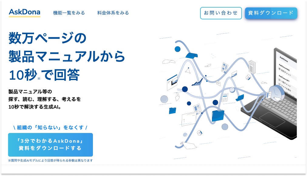 株式会社GFLOPS(本社:東京都渋谷区、代表取締役CEO:盛本マリア、共同代表:鈴木亮祐、以下、以下「当社」)は、法人向けRAGプラットフォーム「AskDona(アスクドナ)」の提供価値をより明確に伝えるため、サービスサイトをリニューアルしたことをお知らせいたします。