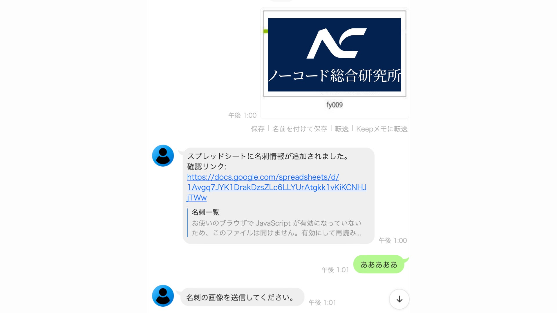 LINEに名刺の写真を送ると、OCRでデータを抽出し、スプレッドシートに自動転記するAIエージェントです。
