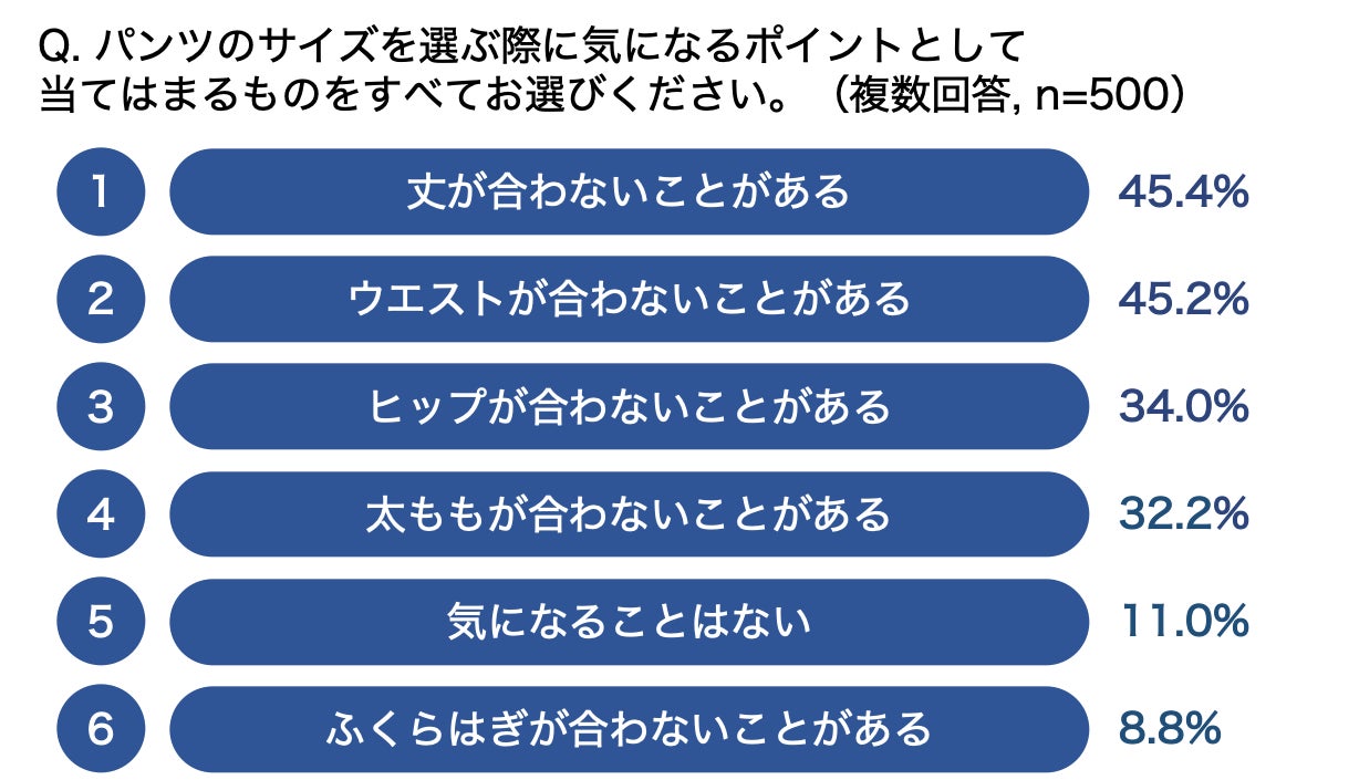 パンツ選びの際に気になるポイントを聞くと、全体の4割以上(45.4%)の人が「丈が合わないことがある」と回答しました。