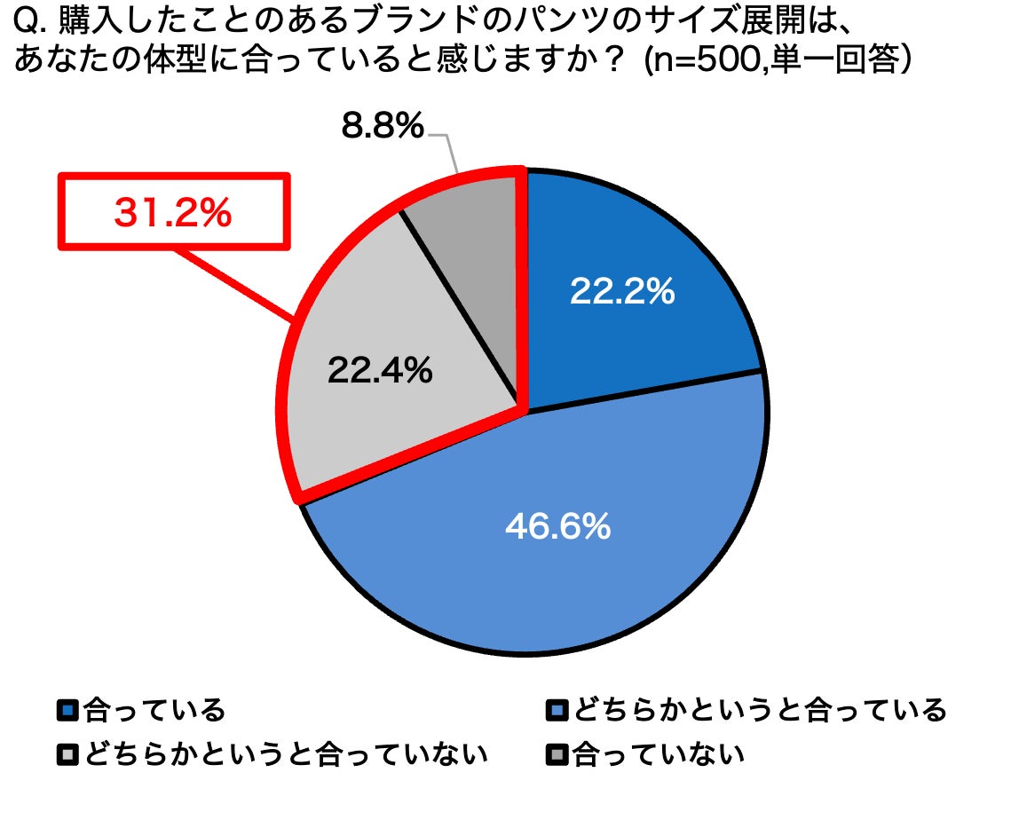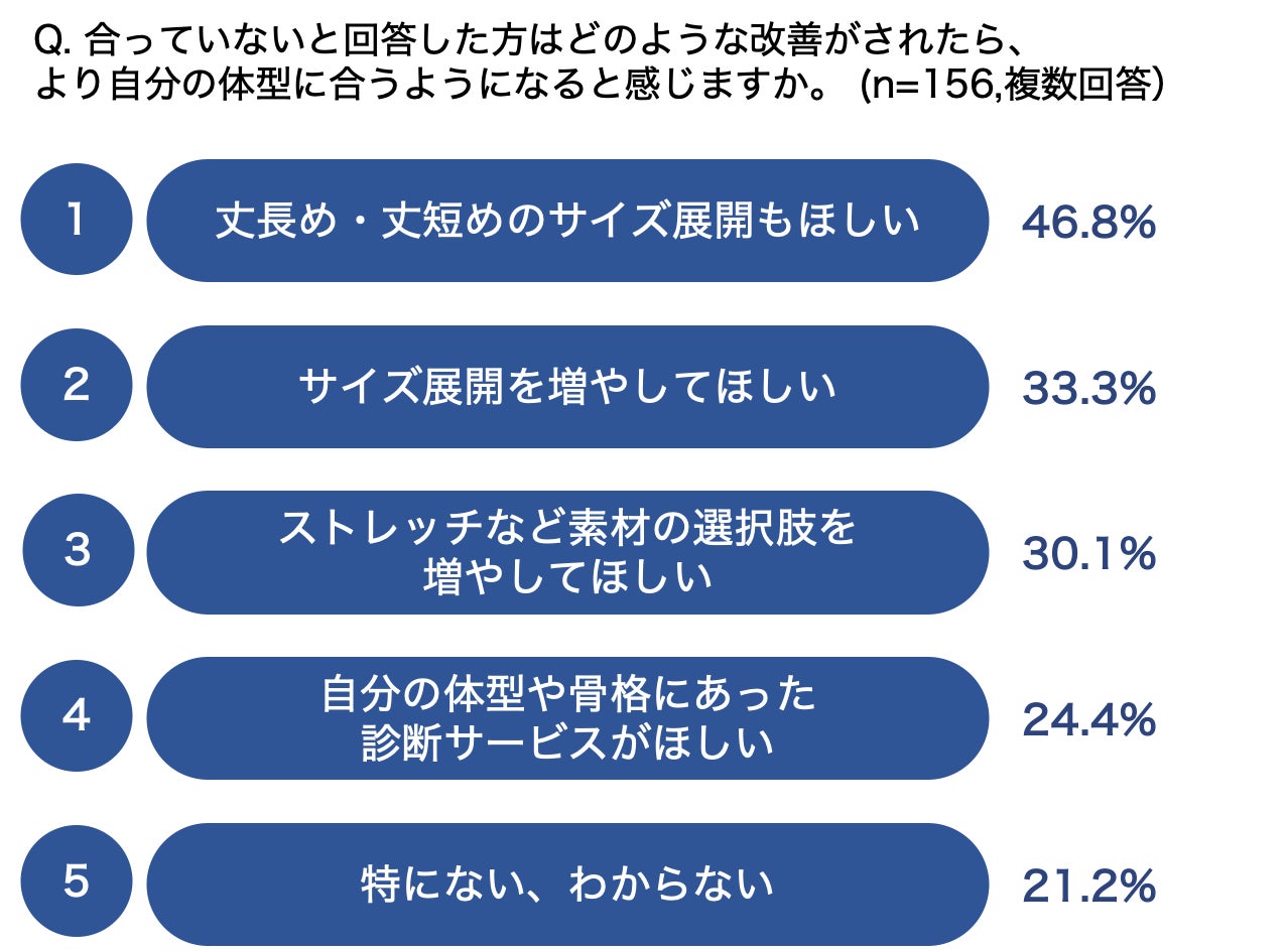 「合っていない」と感じている人に対して、どのような改善がされたらより自分の体型に合うようになるかを聞くと、「丈長め・丈短めのサイズ展開もほしい(46.8%)」という人が最も多く、次いで「サイズ展開を増やしてほしい(33.3%)」という結果となり、パンツの丈やサイズ展開のニーズ・課題があることが明らかとなりました。