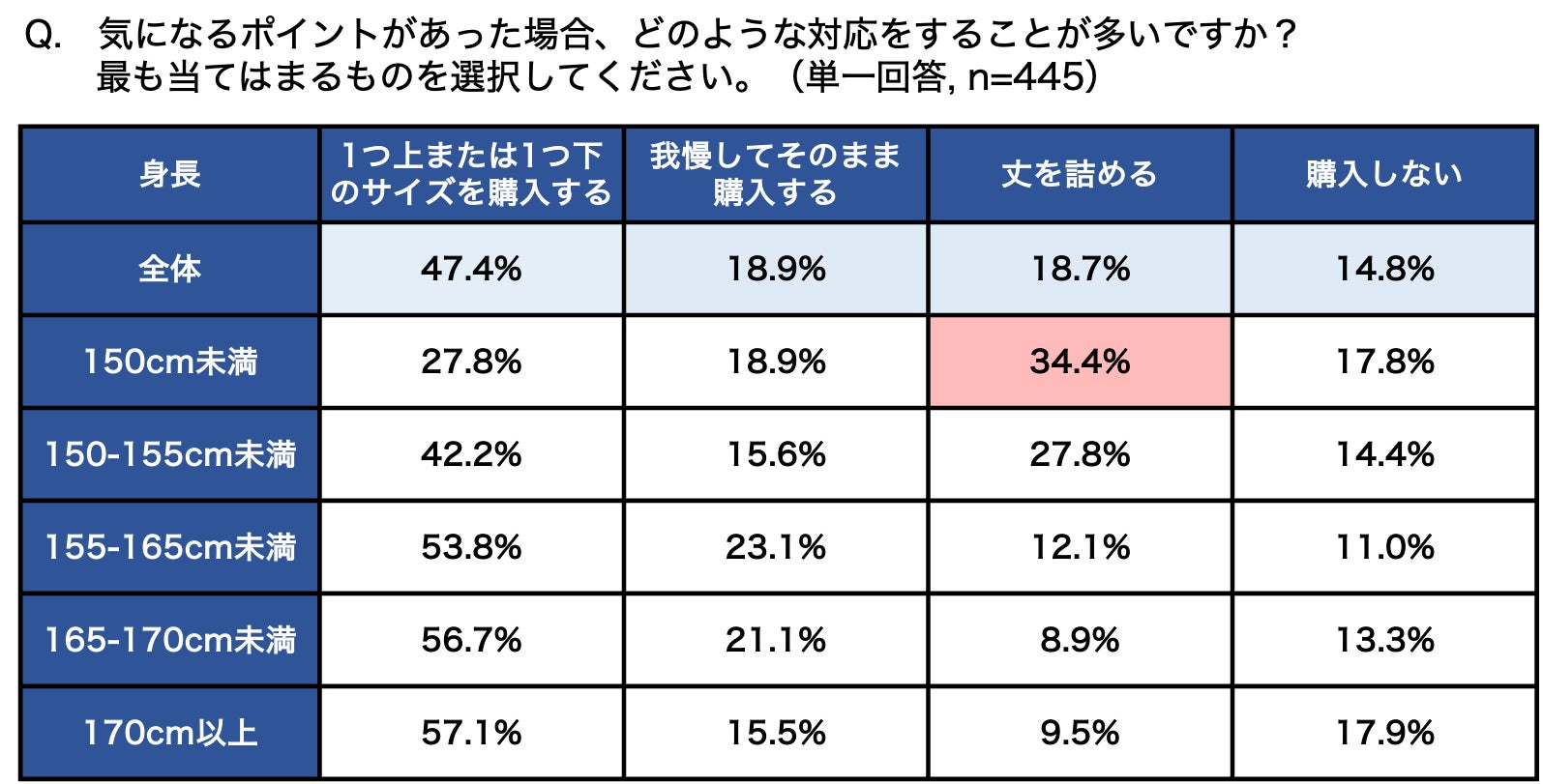 また気になるポイントがあると回答した人に対して、気になるポイントがあった際にどのような対応をすることが多いかを聞くと、「一つ上もしくは一つ下のサイズを購入する」と答えた人が約半数(47.4%)と最も多い結果となりました。他方で、150cm未満の人では「丈を詰める」と回答した人が3割以上(34.4%)と最も多い割合となり、普段Sサイズをはく人の丈のサイズ選びの難しさが見受けられます。
