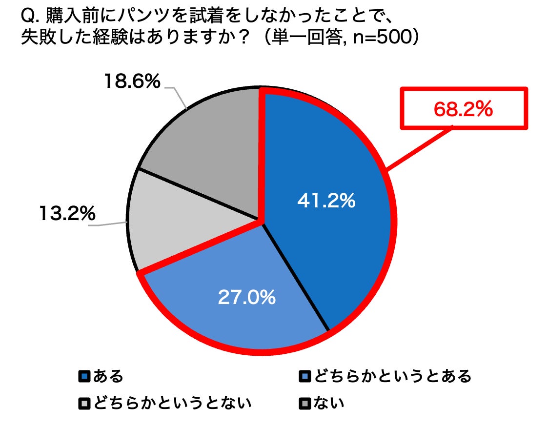 パンツを購入する際の試着経験について、試着をしなかったことで失敗した経験がある人は約7割(68.2%)という結果となりました。具体的にどのような失敗をしたかを聞くと、「ウエストが合わなかった(39.3%)」と回答する人が最も多く、次いで「丈が合わなかった(37.8%)」「ヒップが合わなかった(37.5%)」と自分の体型に合うパンツ選びにおいて、試着の重要性が改めて明らかとなりました。