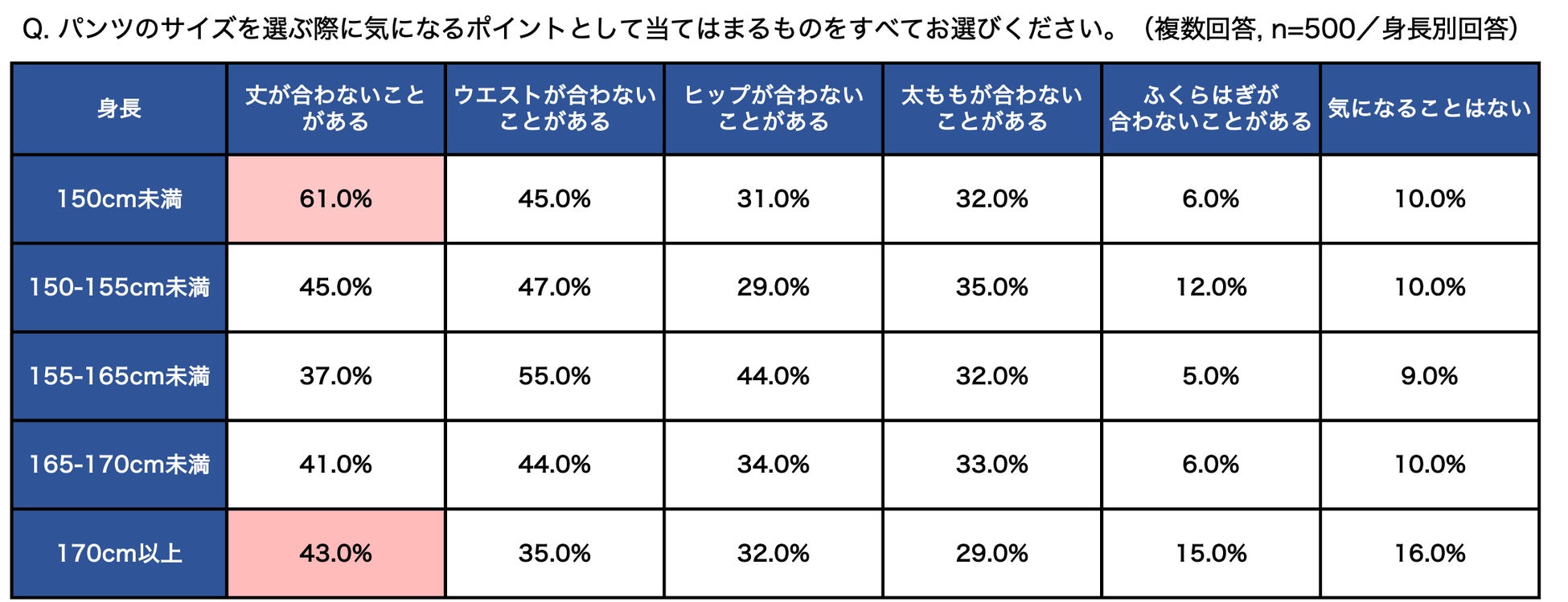 また、身長別の内訳を見ると、150cm未満の人の約6割(61.0%)と170cm以上の人の4割以上(43.0%)が、「丈が合わないことがある」と回答しており、他の項目よりも高い割合であることがわかりました。この結果から、比較的身長の低い人と高い人が、パンツ選びの際に丈を気にしていることが推察されます。