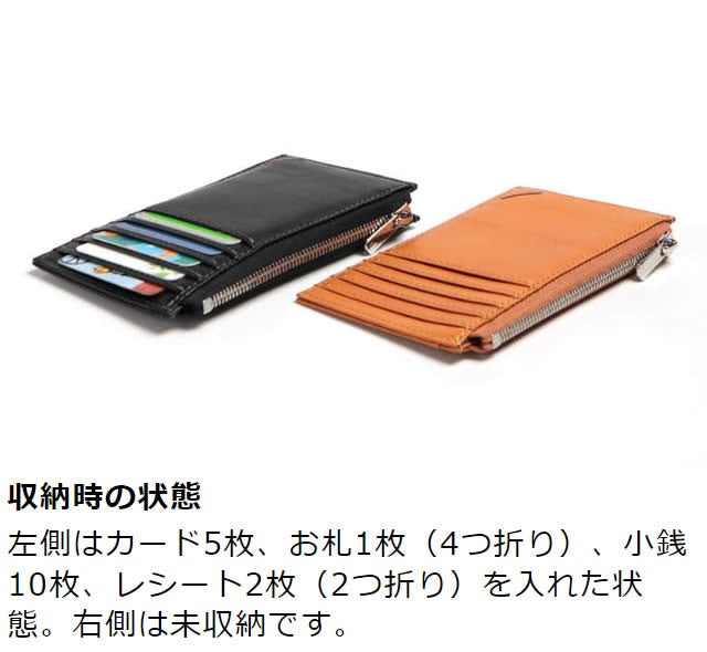 デザインはスリムで細長いシルエットで、厚さは約1.5cm。カード5枚、お札1枚(4つ折り)、小銭10枚、レシート2枚(2つ折り)を入れたときと、何も入れていないときを比較しても厚さがそれほど変わらず、服のポケットなどに収納しやすくなっています。