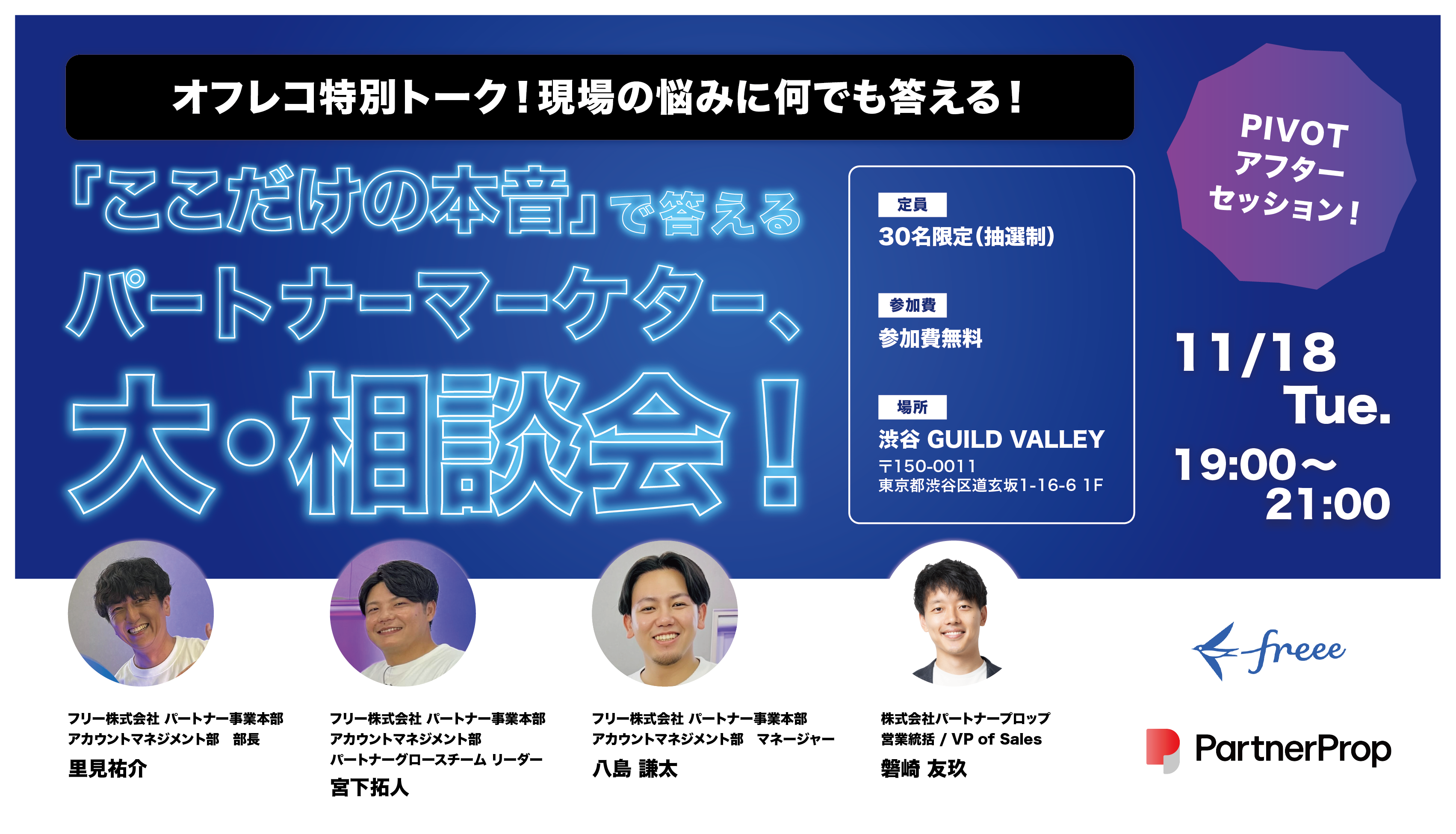本対談動画のPIVOT公開を記念し、パートナーマーケティングをテーマにしたイベントを開催します。オフラインイベントである「PIVOTアフターセッション」には、実際にfreeeの現場で活躍するパートナーマーケターの3氏をお招きし、「パートナープログラム」や「KPIモニタリング」、「パートナーとの打ち合わせ方法」まで、現場のお悩みにその場で答えていく、特別セッションとなります。ここだけしか聞けないオフレコトークも満載です。