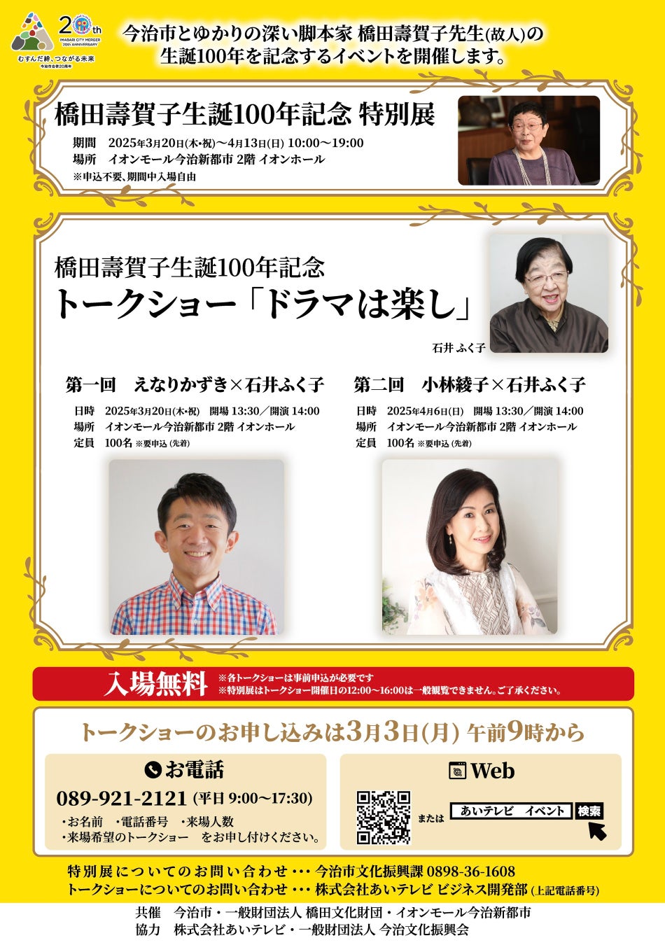2025年の生誕100年を機に、今治市は一般財団法人橋田文化財団、イオンモール今治新都市と協力し、先生の功績を称え、多くの方にその魅力を伝えるため、以下のとおり記念事業を実施します。