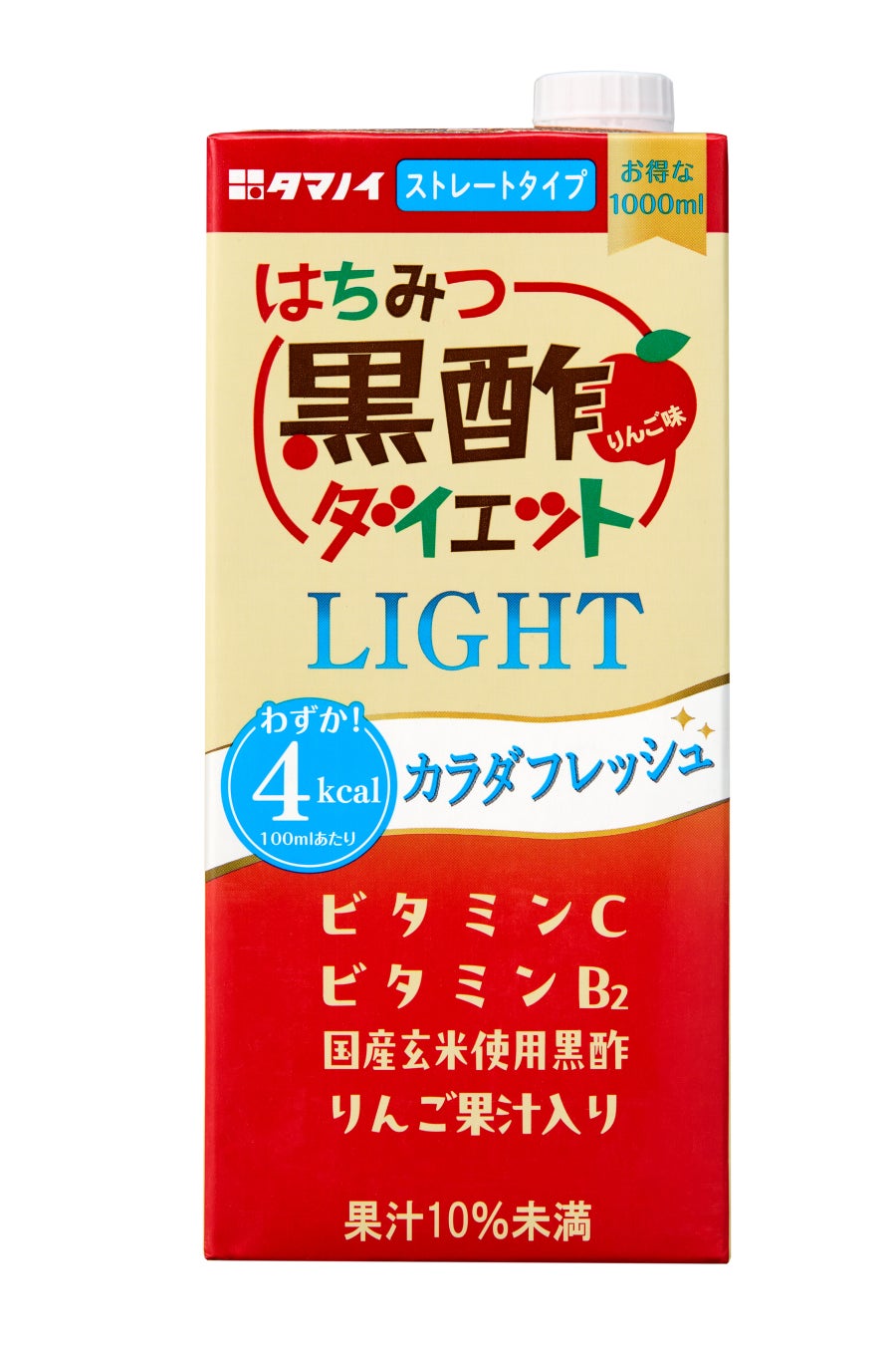 1590年頃、豊臣時代から伝統と革新を紡ぐ醸造酢メーカー、タマノイ酢(株)(本社:大阪府堺市代表取締 役社長:播野貴也、以下当社)は、はちみつ黒酢ダイエットの新シリーズ「はちみつ黒酢ダイエットLIGHT 1L BP」を2025年4月1日より全国にて販売いたします。従来のシリーズよりも低カロリーで爽やかな飲み口 が特徴の、グビグビ飲めるストレートタイプのビネガードリンクです。そのため、お酢が苦手な方でも飲みや すく、運動後や朝の一杯、小腹が空いた時にもピッタリです。お得な大容量1Lサイズで、家族みんなとシェア できます。日々の習慣として「はちみつ黒酢ダイエットLight」をお楽しみください。