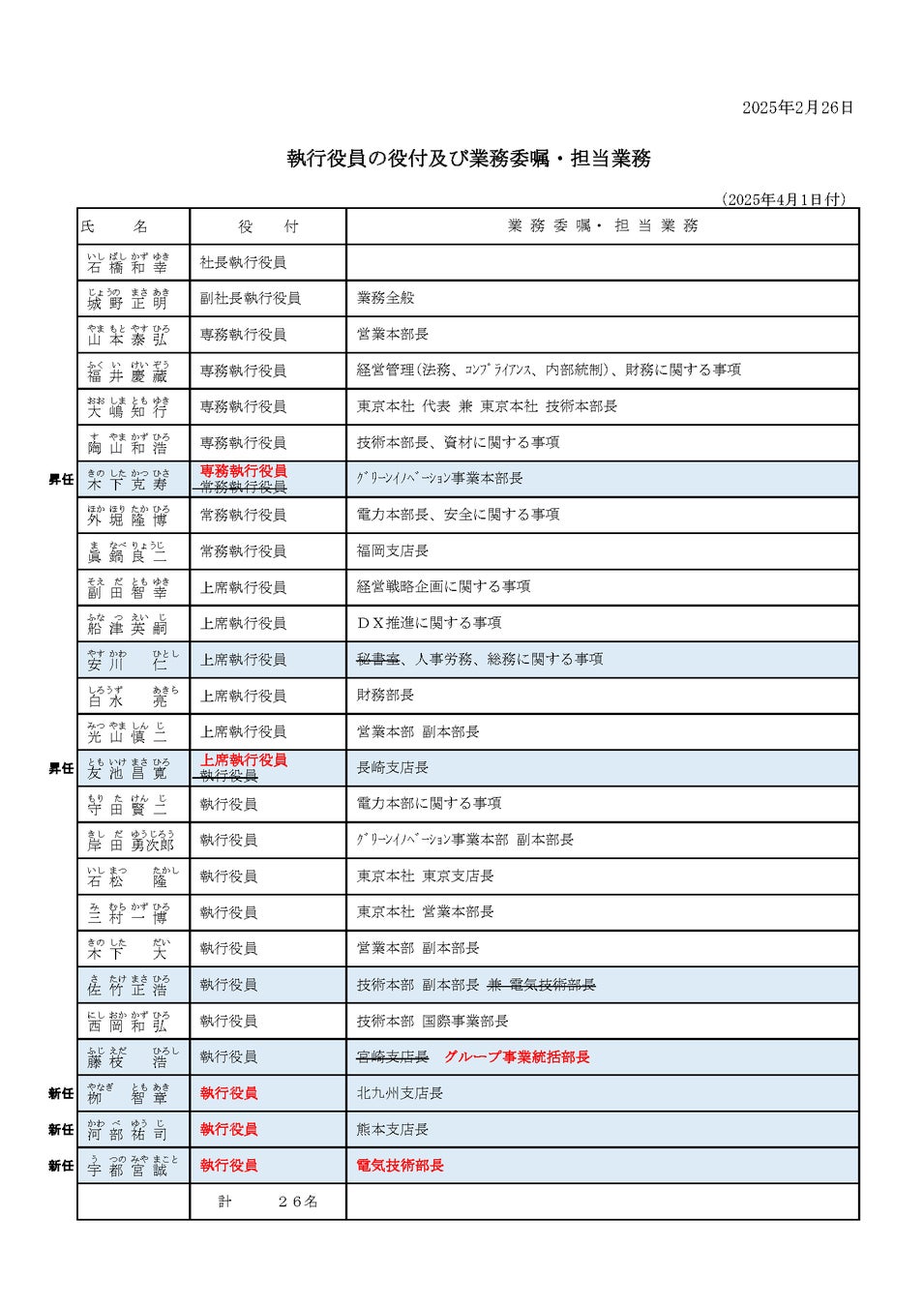 株式会社九電工は、2025年2月26日開催の取締役会において、下記のとおり、役員人事について決議いたしましたので、お知らせいたします。