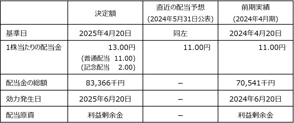 つきましては、株主の皆様からのご支援に感謝の意を表するため、2025年4月期の期末配当金におきまして、1株当たり2円の記念配当を実施させていただきます。これにより、2025年4月期の1株当たり期末配当金は、普通配当11円に記念配当2円を加え、13円となります。
