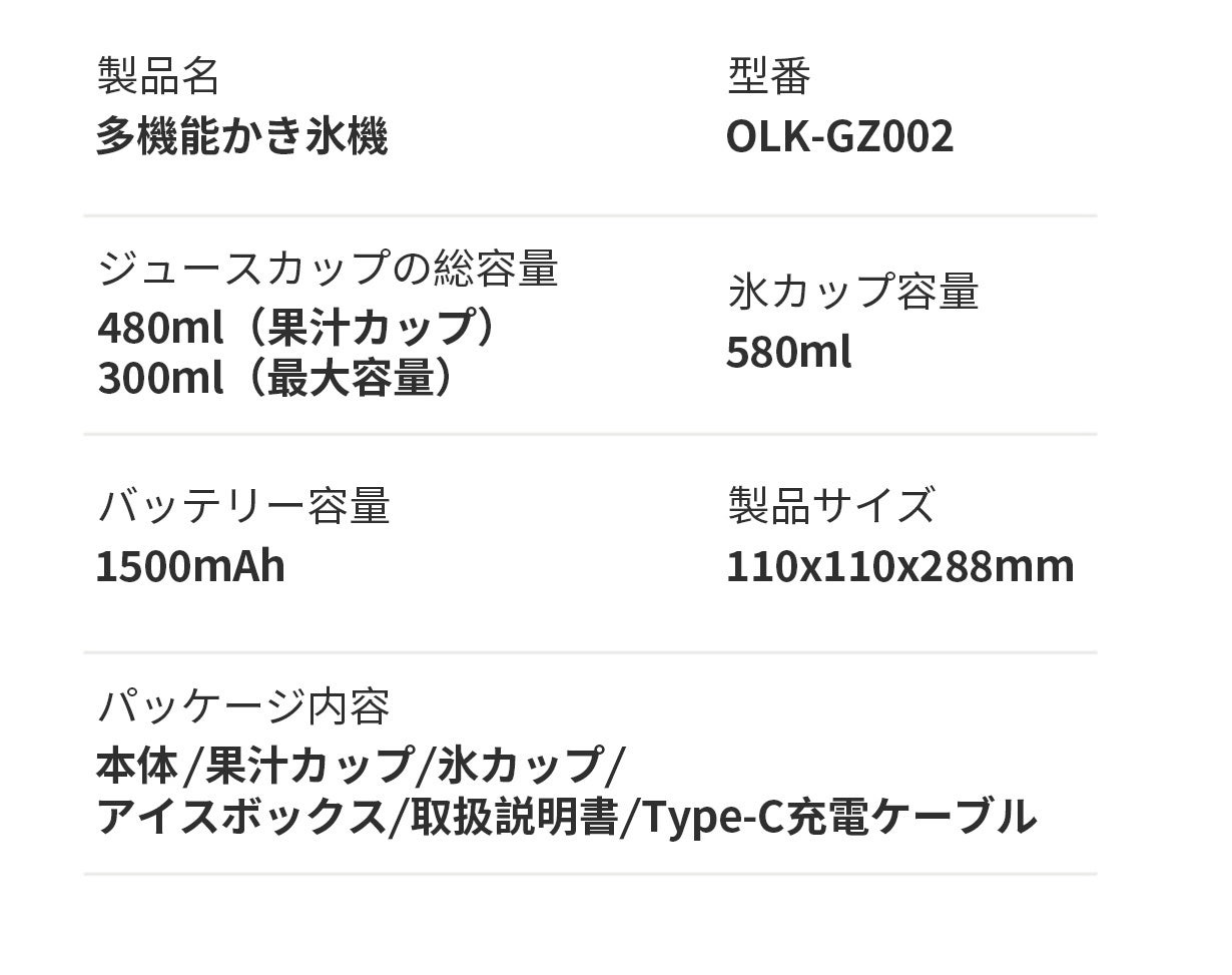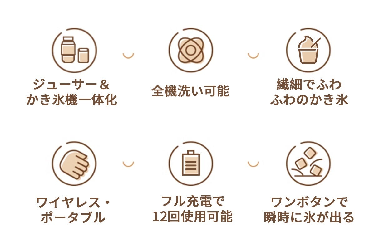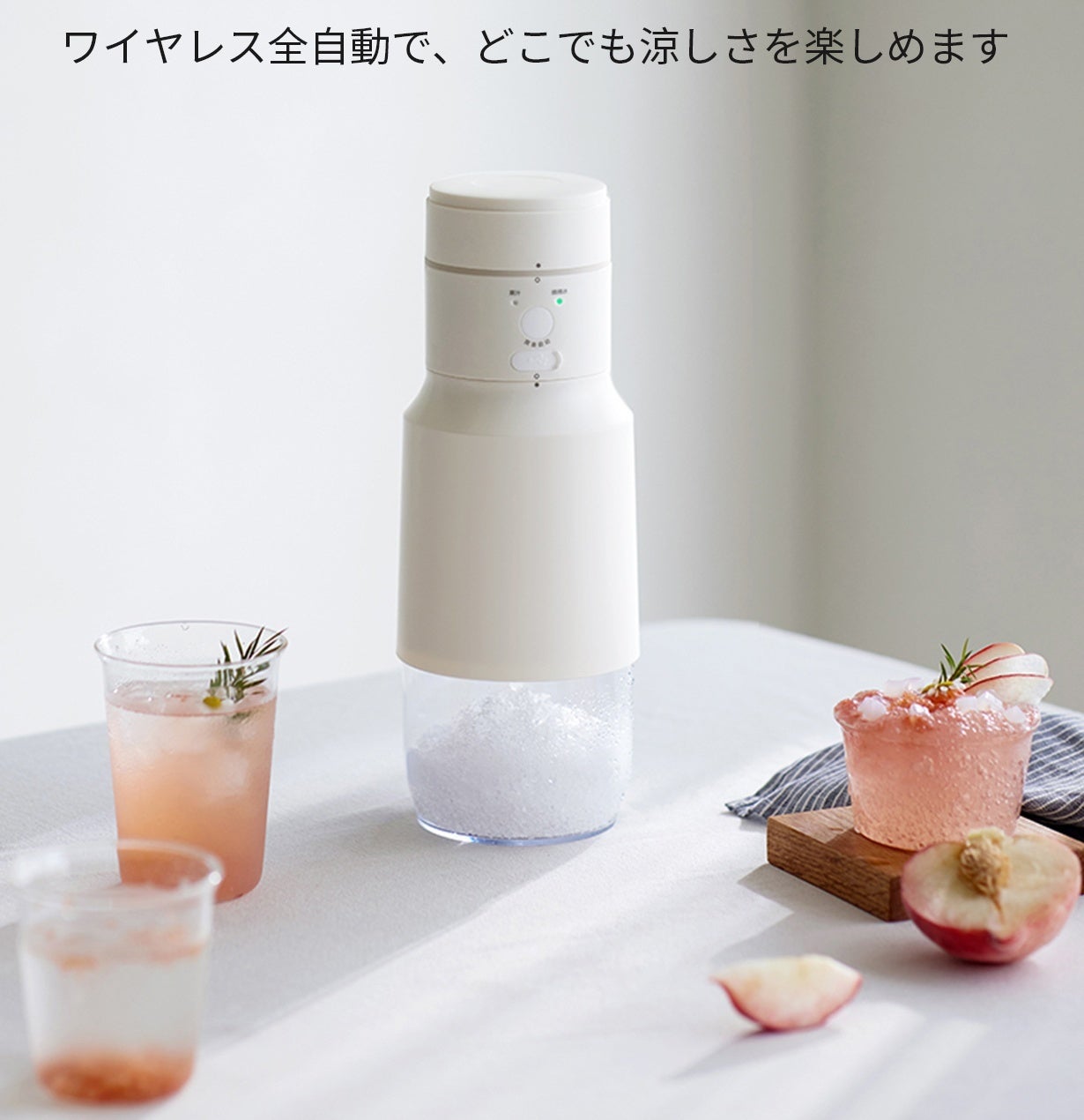 ジューサーとかき氷機が一体化した新感覚デバイス登場!フル充電で12回以上の使用が可能で、全機洗い対応。ワンタッチで2秒後にはふわふわのかき氷が楽しめます。これ一台で、夏の楽しみを手軽に満喫しましょう。