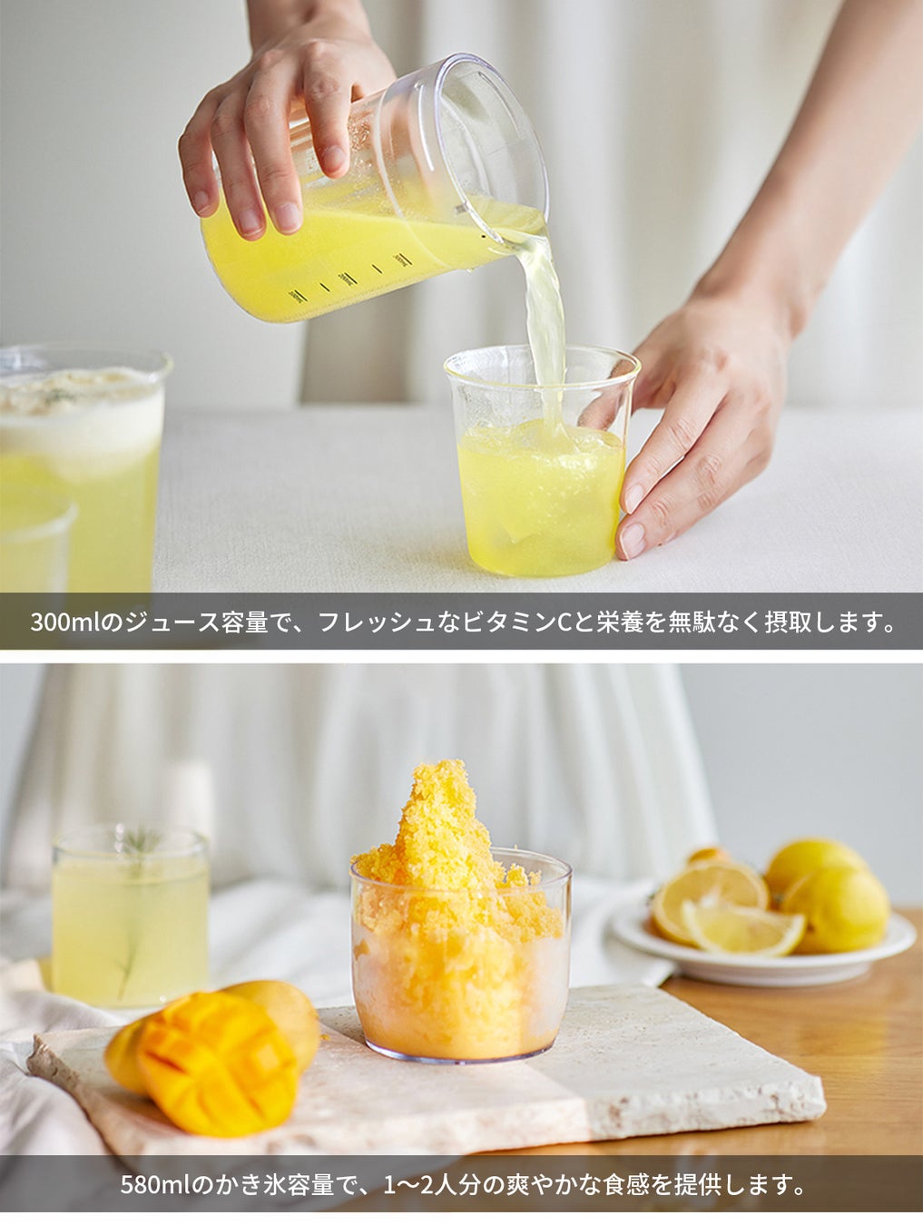ジューサーとかき氷機が一体化。滑らかな果汁と雪のようなかき氷で、いつでも素敵な時を楽しめます。