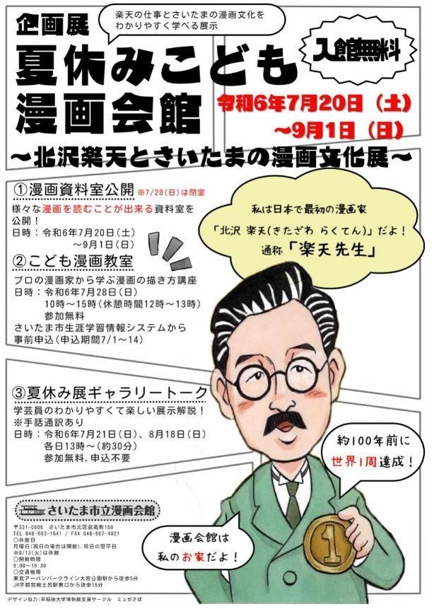 さいたま市内小中学校の夏休み期間(7月20日(土)~9月1日(日))に合わせて、日本で最初の職業漫画家として知られる北沢楽天や楽天漫画について、わかりやすく解説したパネルを中心に展示します。また、同期間に様々な漫画を読むことができる漫画資料室を公開します。さらに、プロの漫画家から漫画の描き方を学べる講座や、学芸員のわかりやすくて楽しい展示解説も実施します。参加無料でわかりやすく学べる展覧会です。皆様のご来館をお待ちしています。