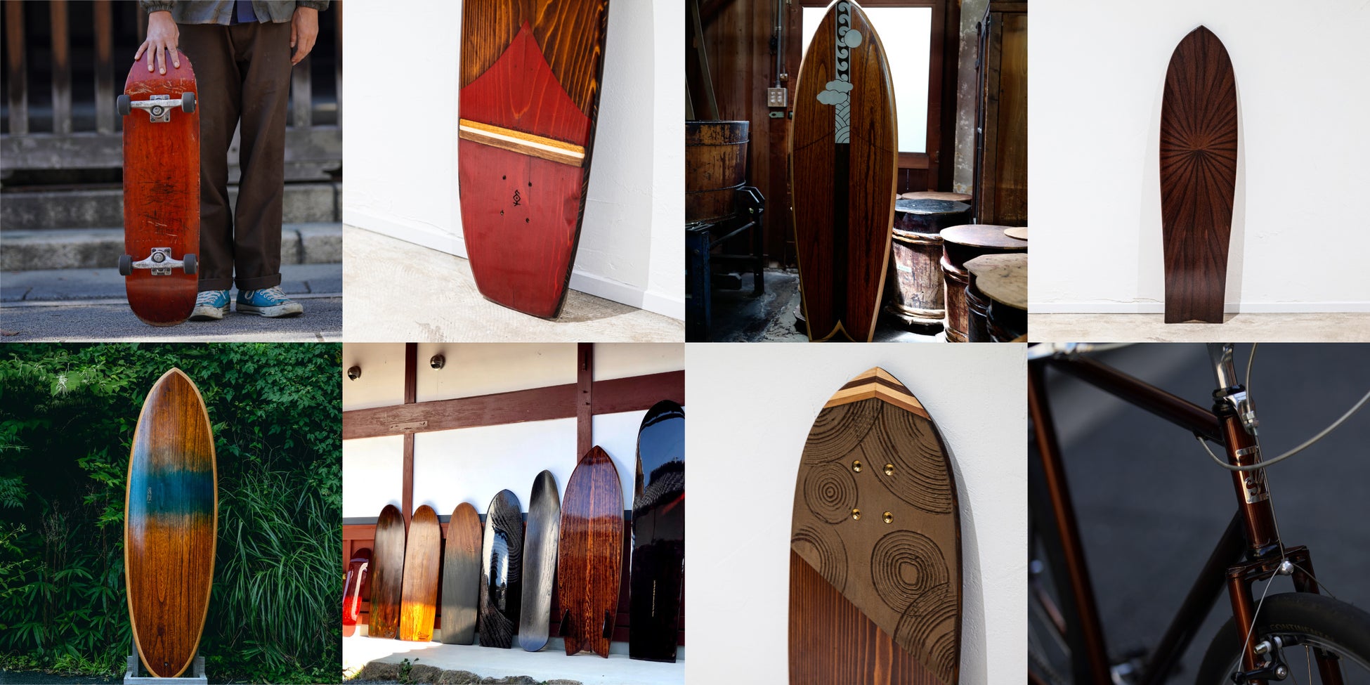 ウッドサーフボードやスケートデッキなど木製のアイテムはもちろん、自転車のフレームのような金属面にまで漆塗装を施した一品まで、「漆&○○とは。」を体感できるラインナップとなります。
