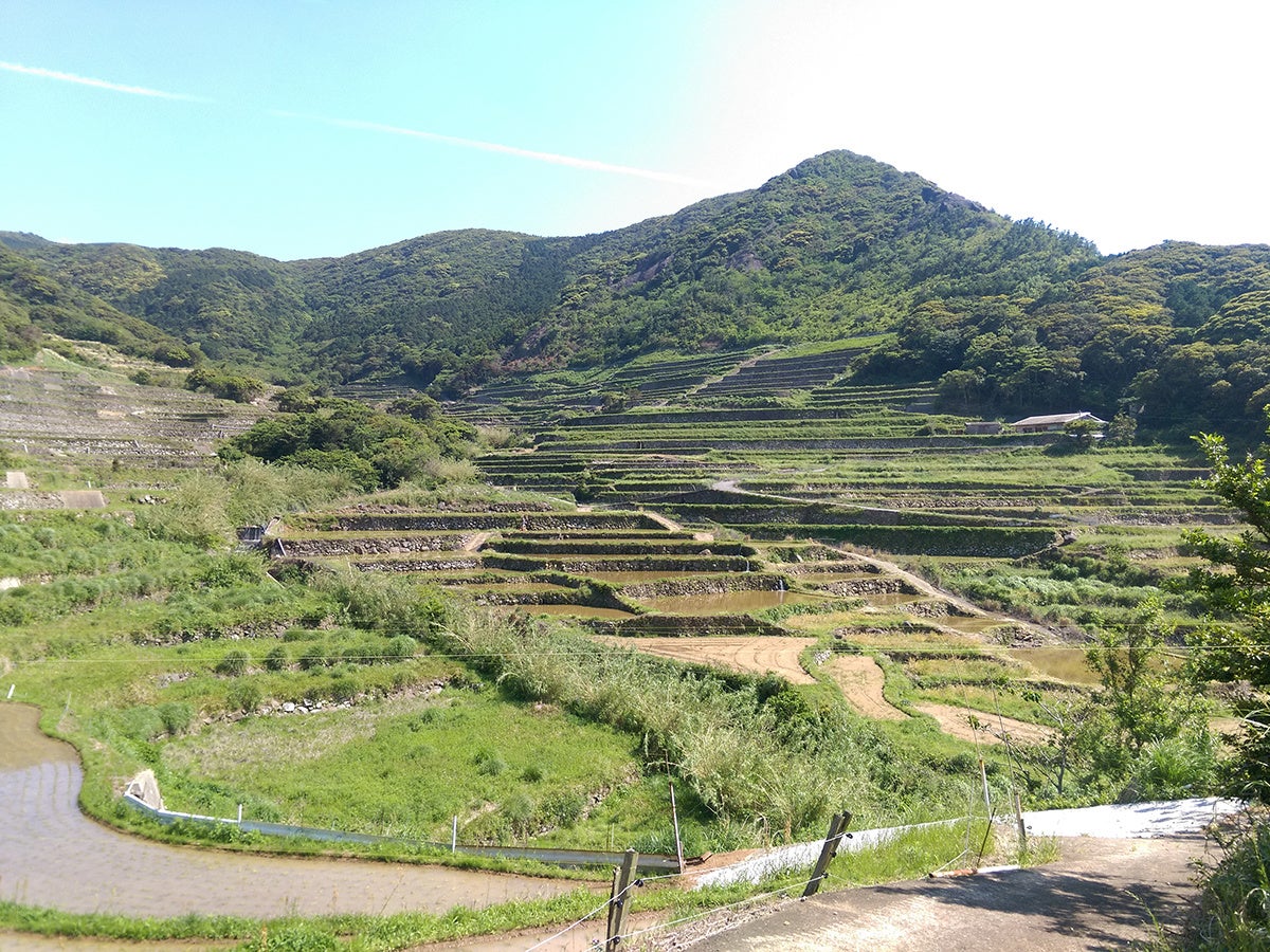 春日集落は、古くからの信仰の山・安満岳を仰ぎ、川に沿って広大な棚田が広がる。
