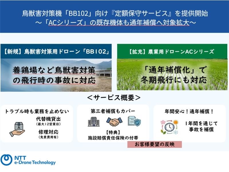 株式会社NTT e-Drone Technology(以下、NTTイードローン)は、新型鳥獣害対策用ドローン「BB102」をご利用のお客さまを対象とした『定額保守サービス』を2026年4月1日(水)より提供開始いたします。また、本提供開始に合わせ、既に『定額保守サービス』をご利用いただいている農業用ドローン「ACシリーズ(AC102、AC101 connect)」のお客さまにつきましても、ご要望の多かった「通年補償(冬期免責の撤廃)」を実施し、2026年4月1日(水)よりサービス内容を大幅に拡充いたしました。