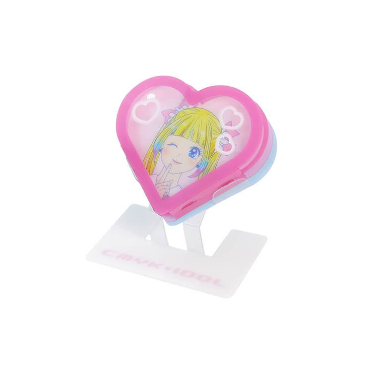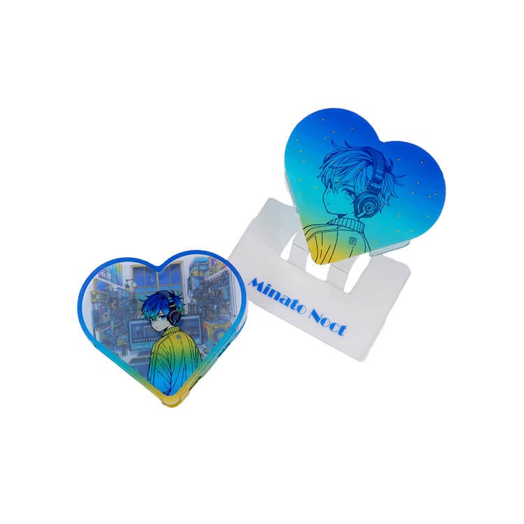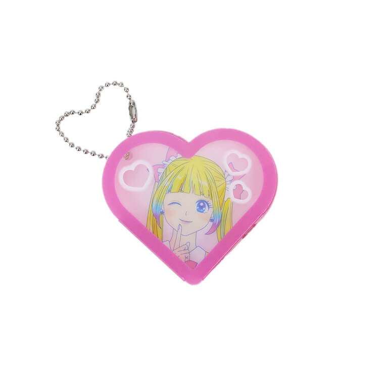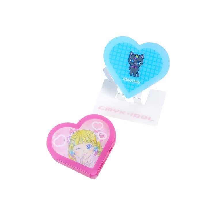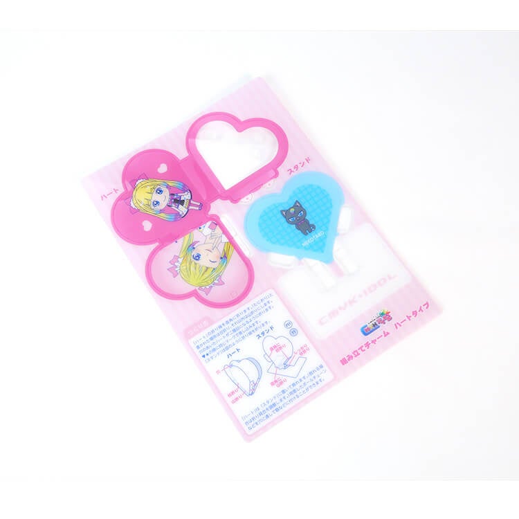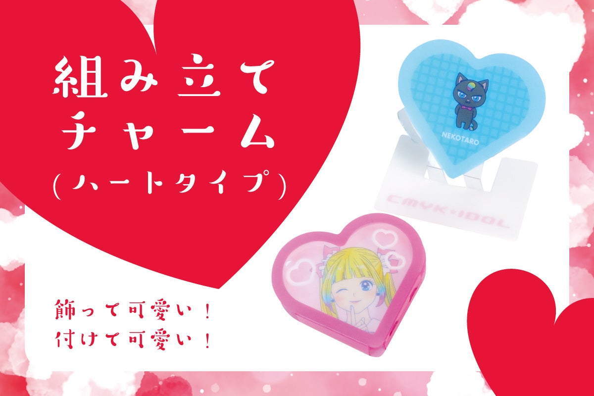『組み立てチャーム(ハートタイプ)』はハート型の組み立て式チャームです。三層構造のため、レイヤーを活かしたデザインが映えます。全面フルカラー印刷可能で、キャラクターグッズとしておすすめです。