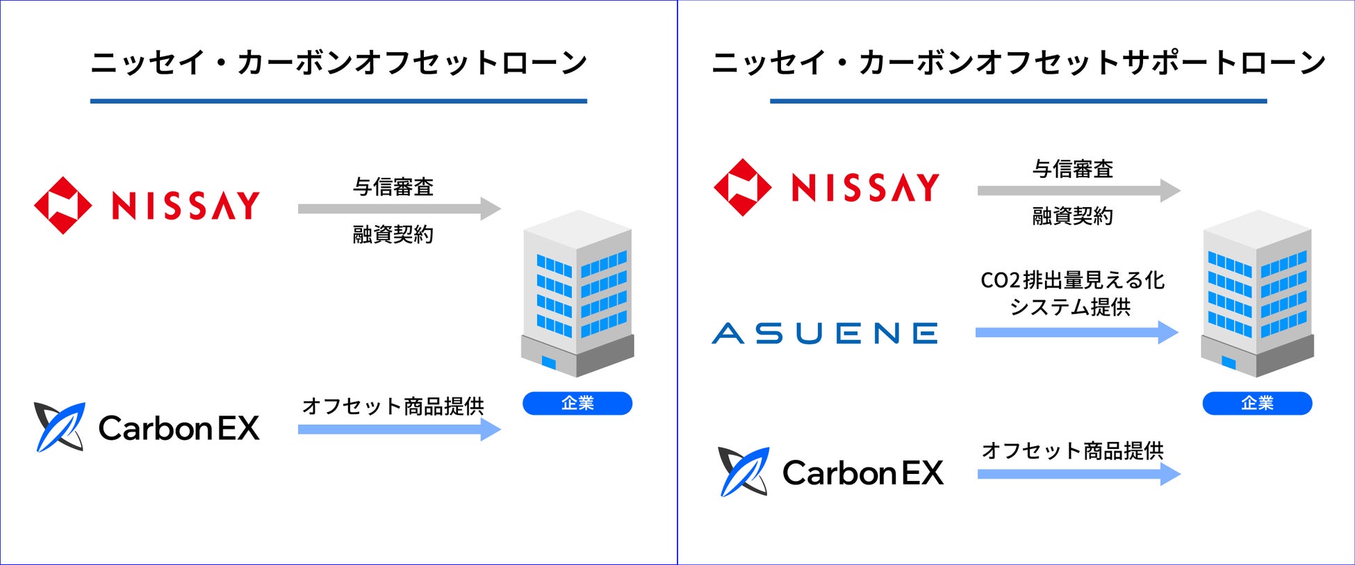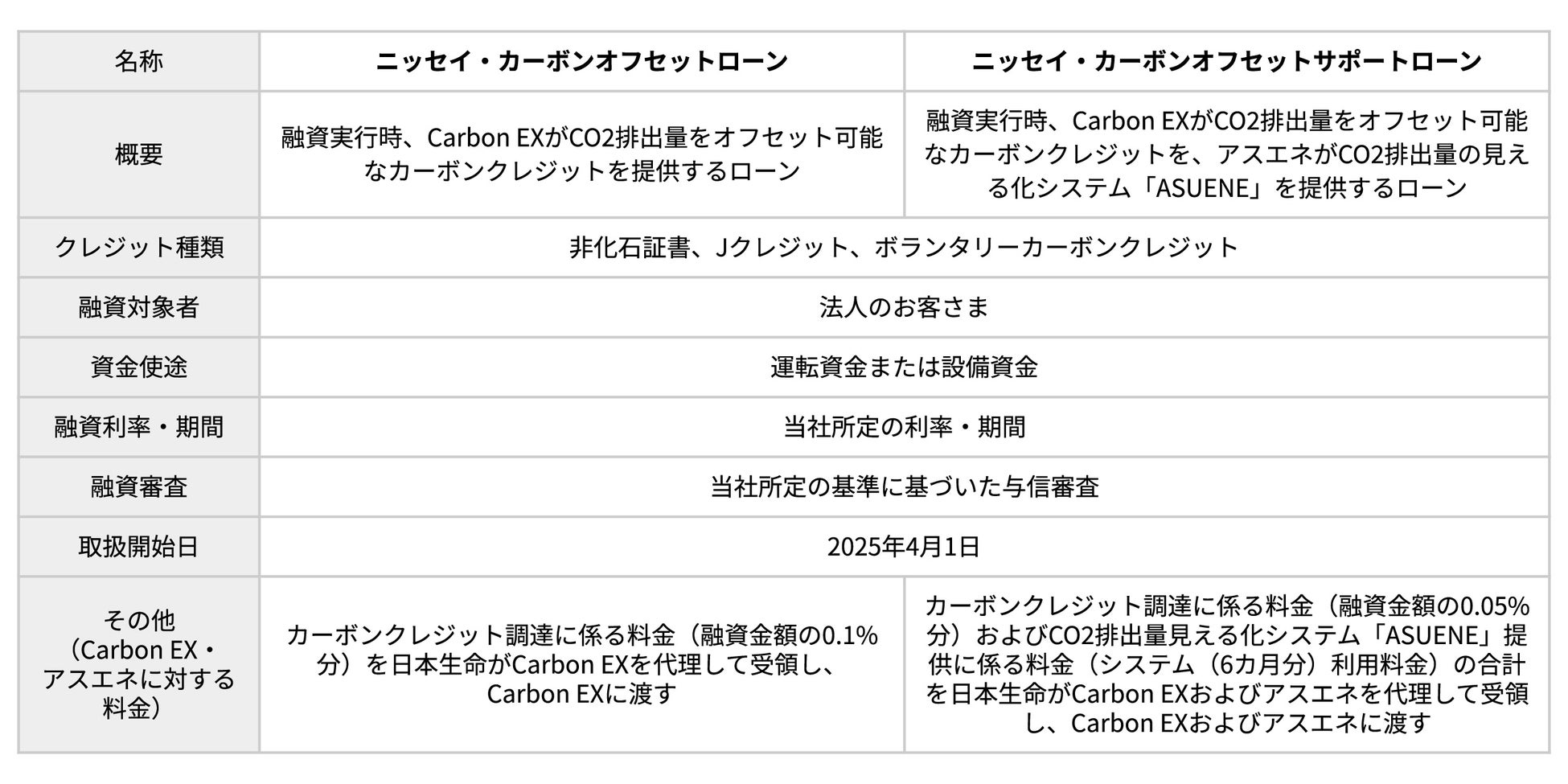 Carbon EX株式会社(本社:東京都港区、代表取締役CEO:西和田 浩平・竹田 峻輔、以下「Carbon EX」)とアスエネ株式会社(本社:東京都港区、代表取締役CEO:西和田 浩平、以下「アスエネ」)が、日本生命保険相互会社(本店:大阪府大阪市、代表取締役社長:清水 博、以下「日本生命」)の新商品「ニッセイ・カーボンオフセットローン」および「ニッセイ・カーボンオフセットサポートローン」(以下「本商品」)にサービスを提供開始しました。